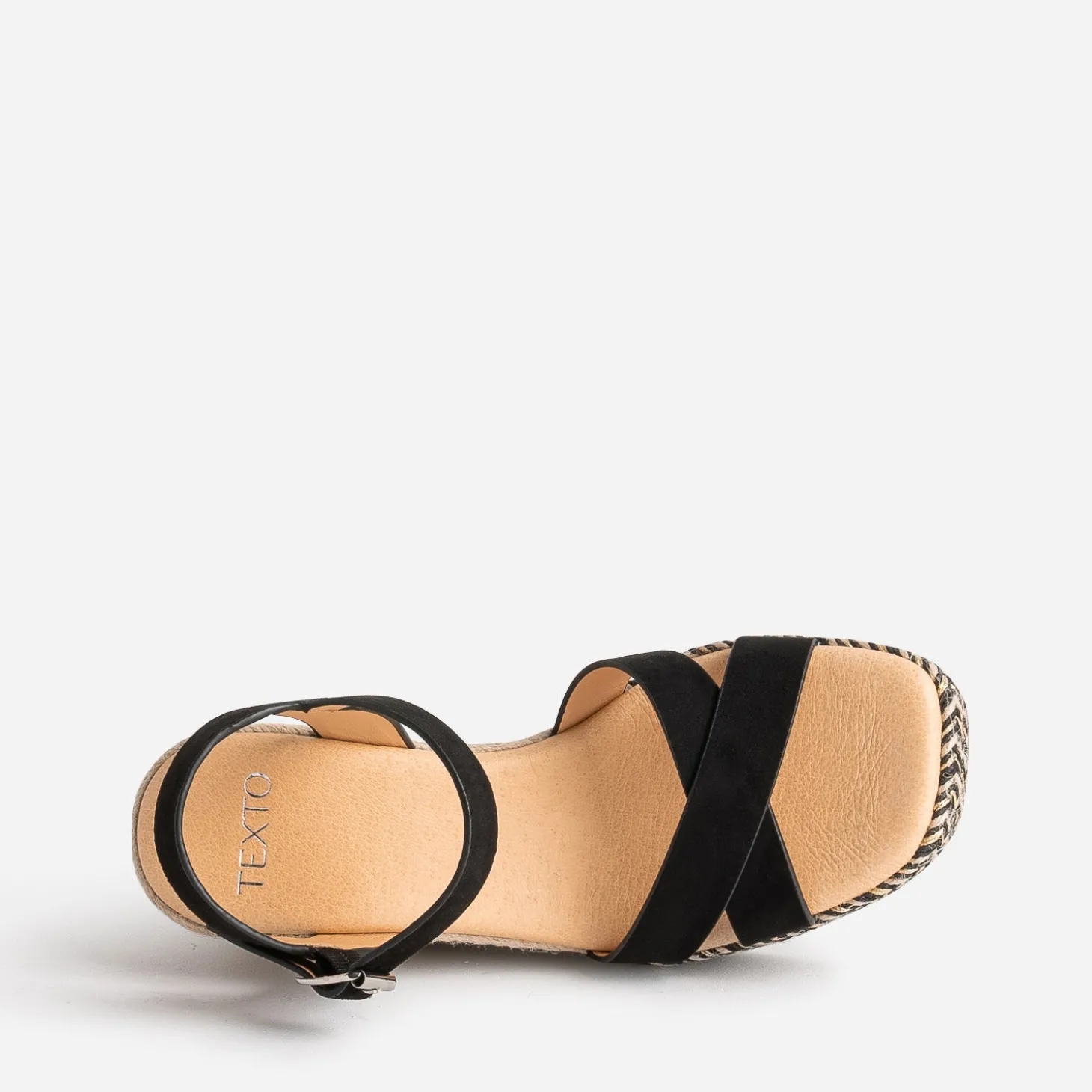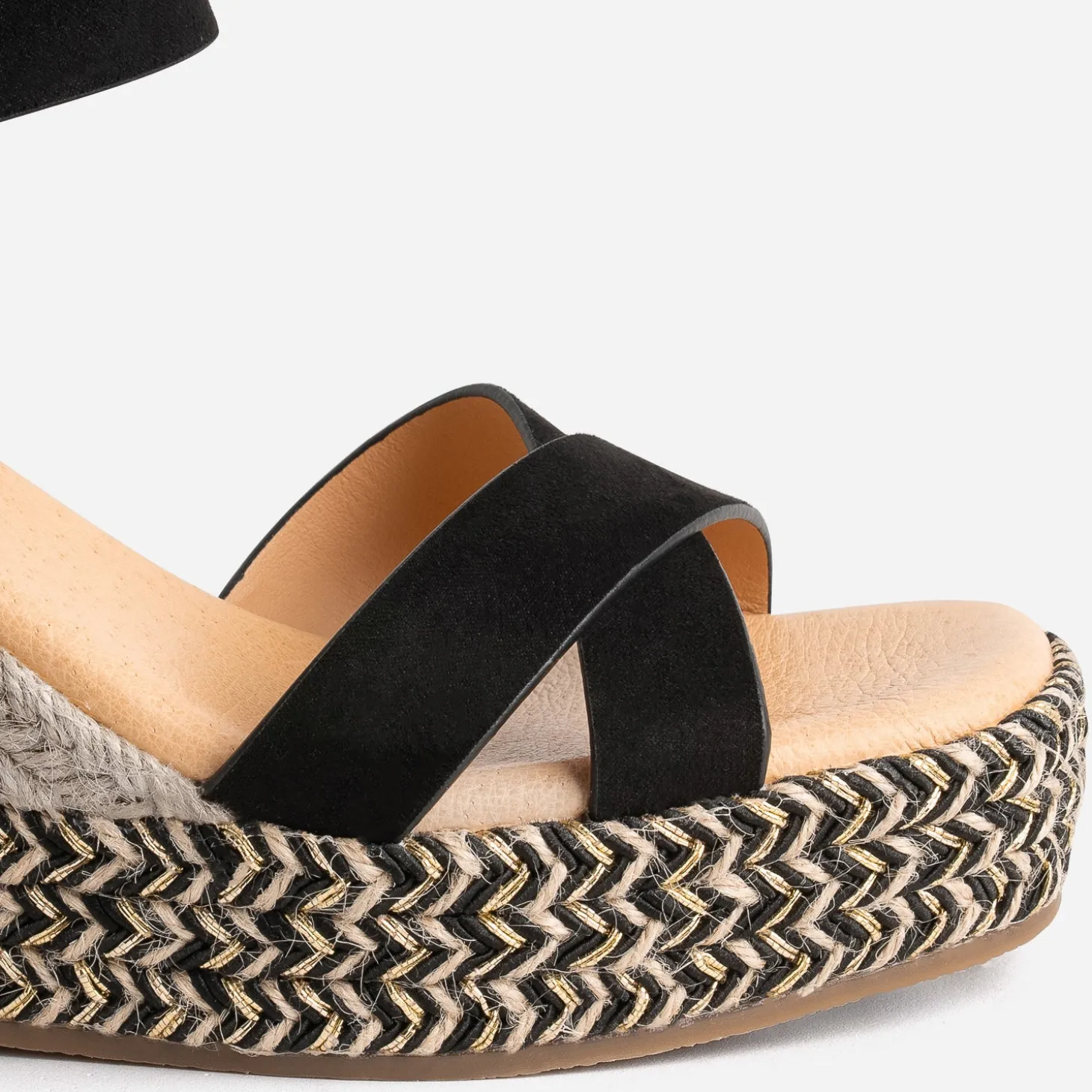 Faites confiance à la sandale compensée, pour vous accompagner tout au long de l’été. Les brides, en matière synthétique suédée, osent un coloris noir, qui fait écho à la semelle en corde. 9 cm à l’arrière, 3 cm à l’avant, et une semelle première moussée, pour un confort inégalé. Adoptez tout de suite un esprit aventurier, en l’associant avec une veste saharienne, un jean blanc carré et de gros bracelets en bois.