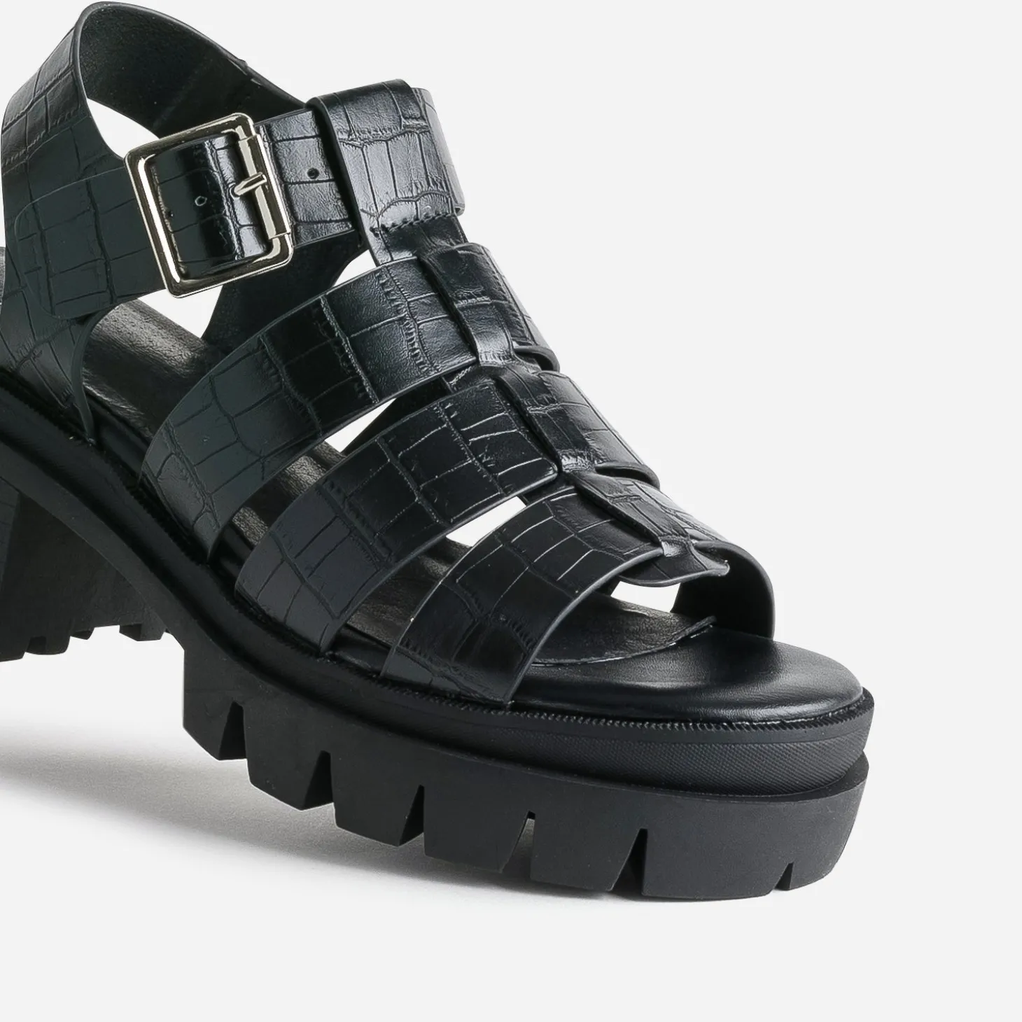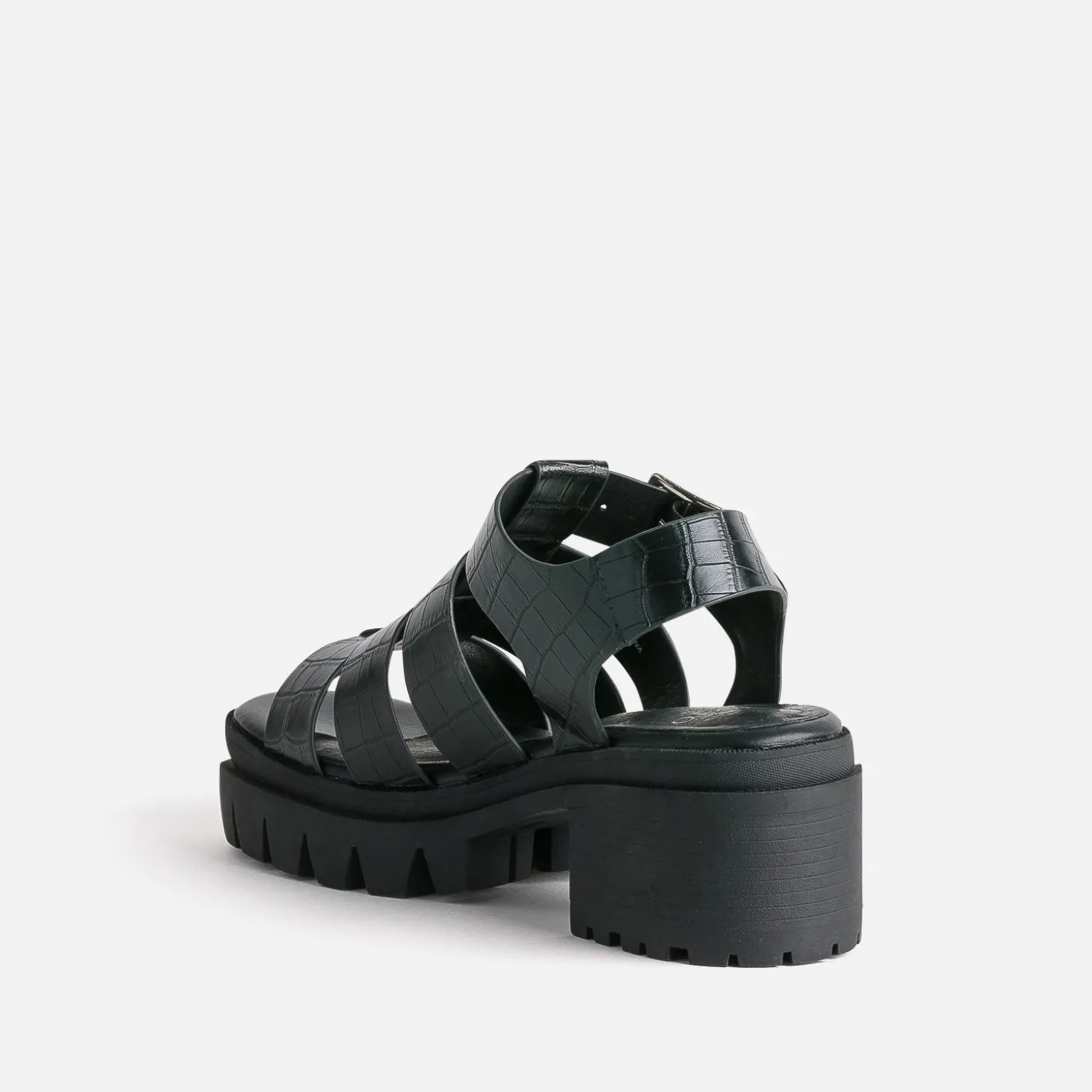 La sandale se réinvente. Les modèles plus imposants ont définitivement la cote cette saison. En matière synthétique noire, la sandale femme se pare d’un embossage effet croco sur ses larges brides et se ferme par une boucle carrée en métal argenté. Montée sur une semelle épaisse et crantée, elle affirme un style décontracté inspiré du streetwear. Un modèle à jouer avec des vêtements fluides, comme un cropped top et un pantalon large.