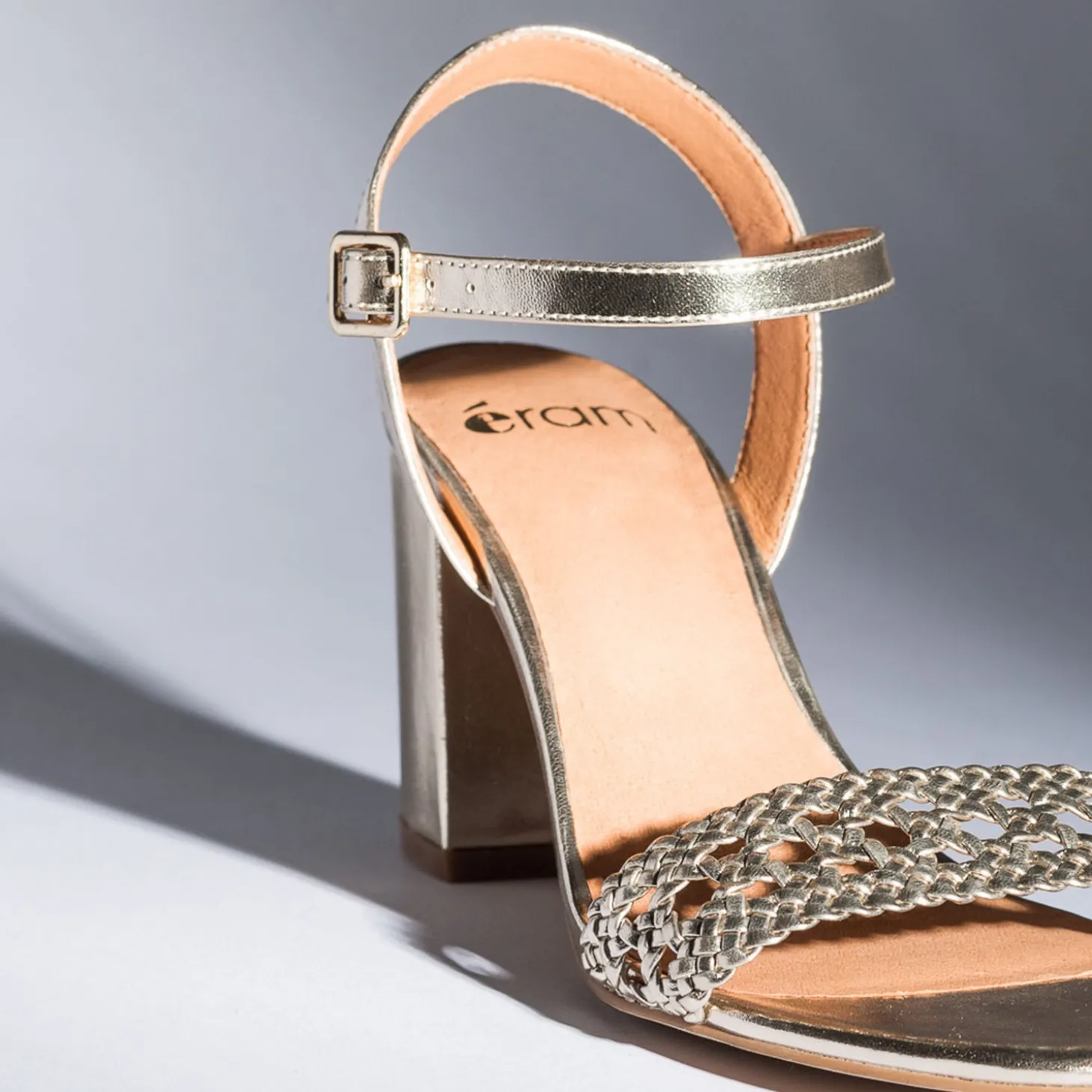 Vous avez aimé le boots doré ? Vous pouvez craquer pour la sandale, cet été. En matière synthétique, elle présente une finition métallisée jusqu’à la pointe du talon et une bride tressée ajourée sur le dessus du pied. Un modèle à réserver pour un jour d’exception, avec ou sans invitation.