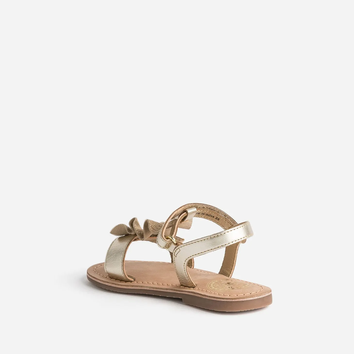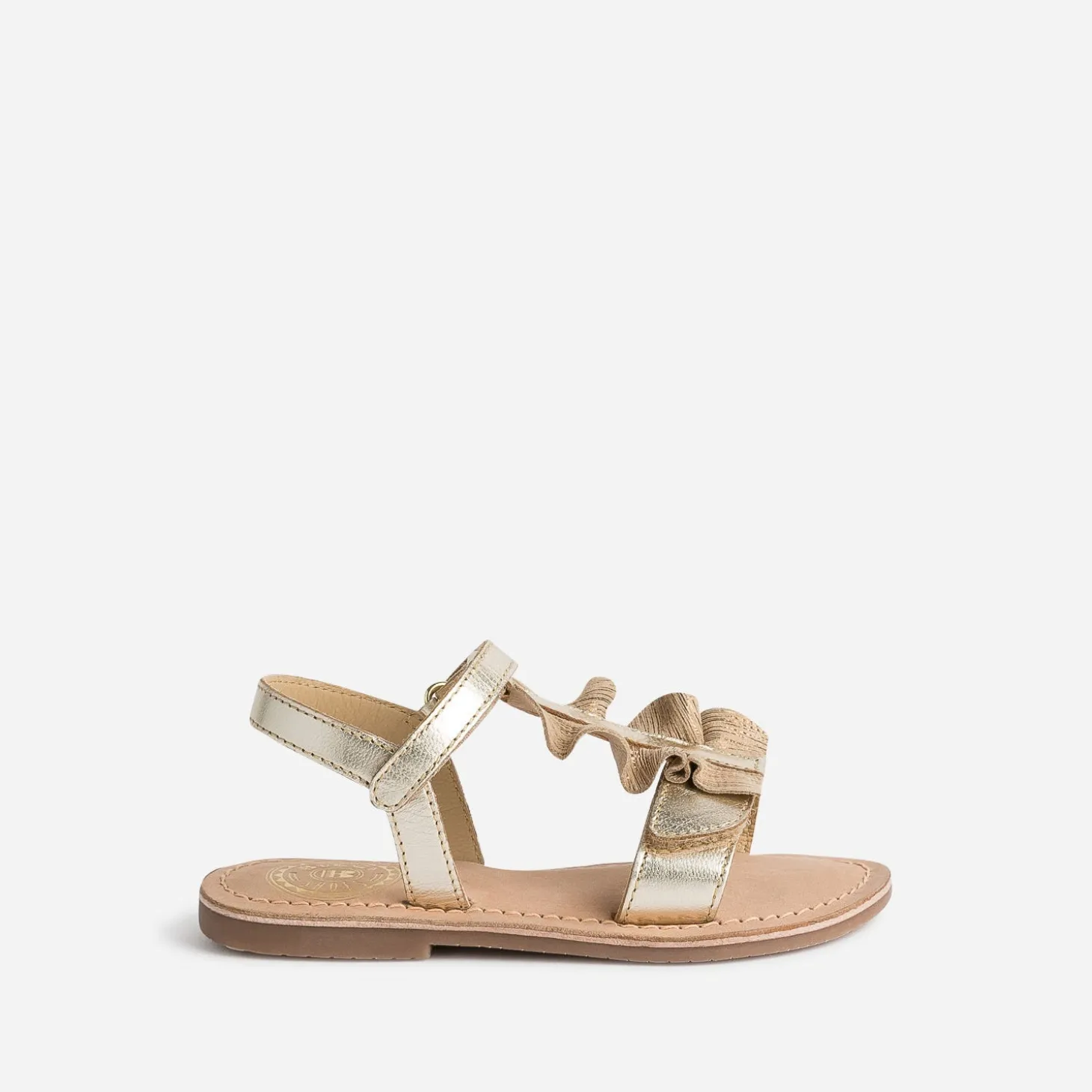 Tout en cuir, tout dorée, cette sandale fille ne va pas la quitter de tout l’été. Deux scratchs permettent d’ajuster le maintien du pied, renforcé par une bride en T, décorée d’un volant.