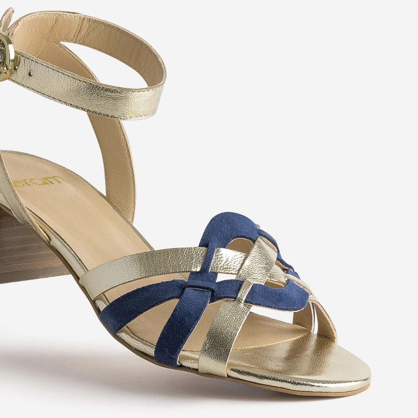 Subtils jeux de brides croisées et entrelacées, cuir lisse et cuir velours, coloris doré et bleu roi. Cette sandale femme fait, de ses dualités, une vraie force. Elle est montée sur un petit talon flare, pour gagner 4,5 cm. Avec un look denim en journée, elle s’invite facilement avec une tenue plus sophistiquée, pour une sortie ou une occasion spéciale.