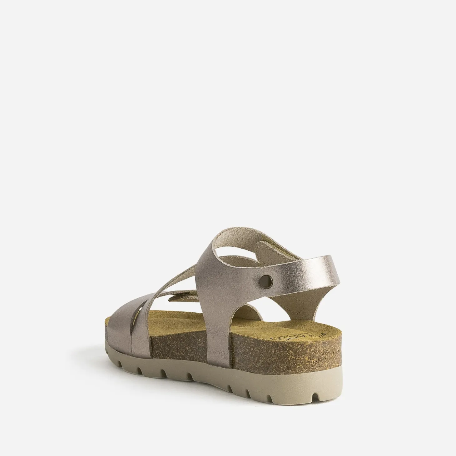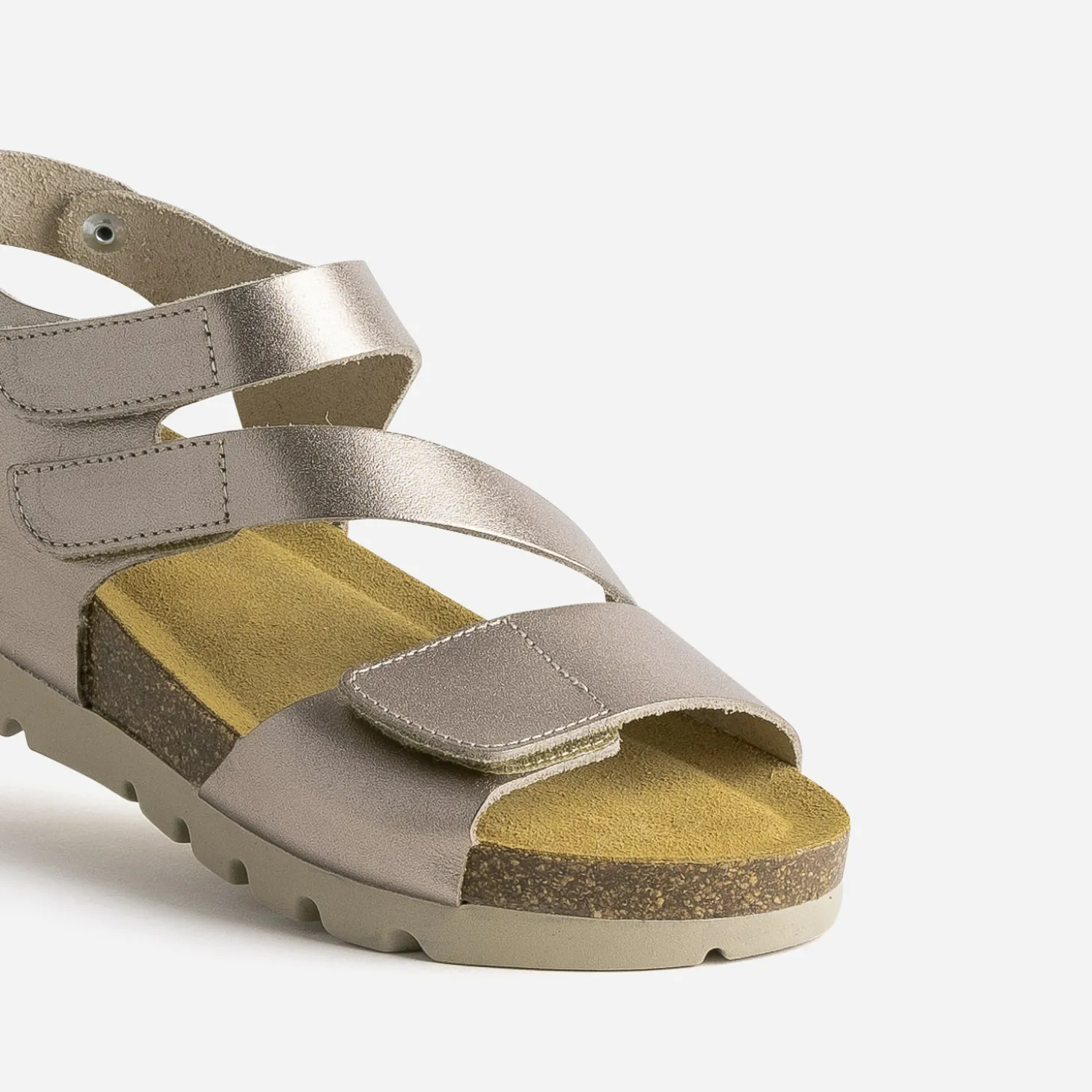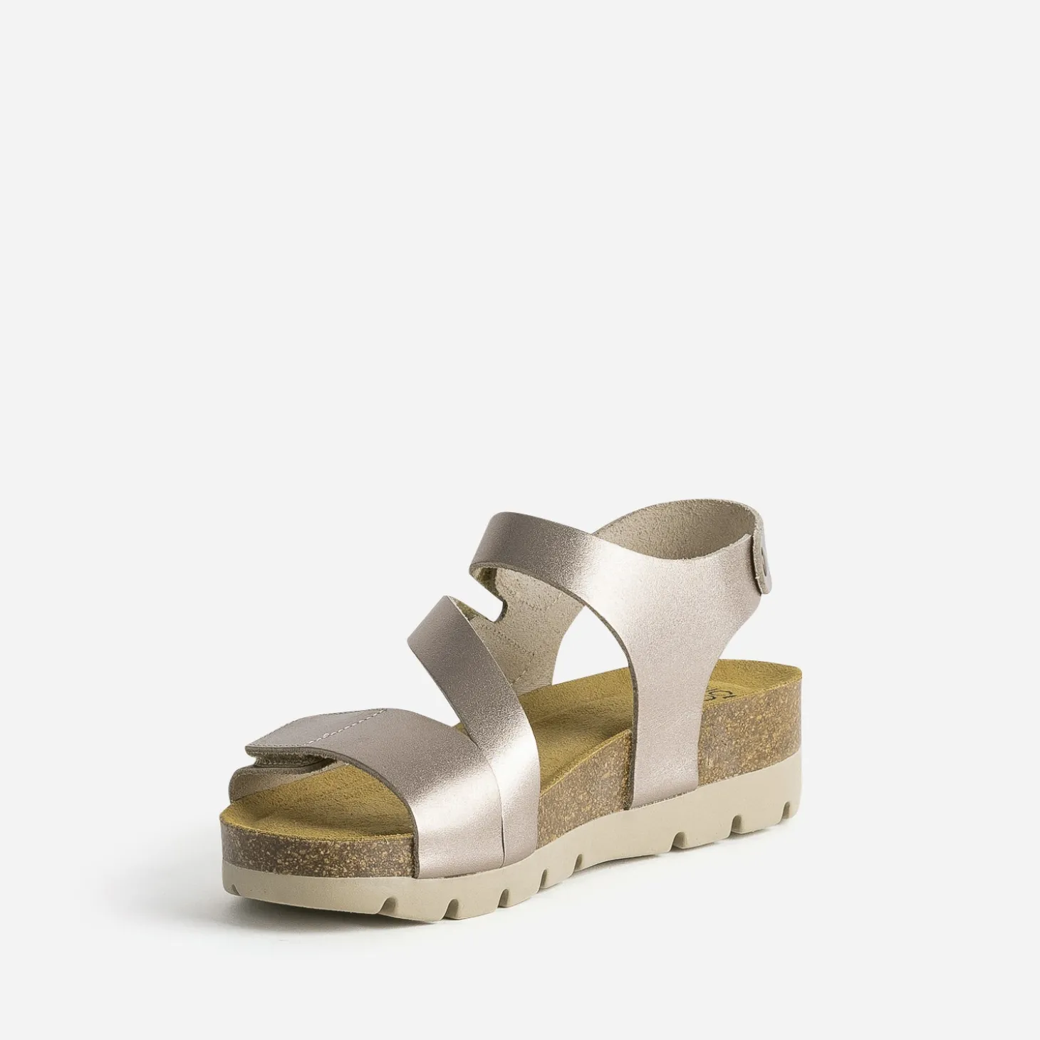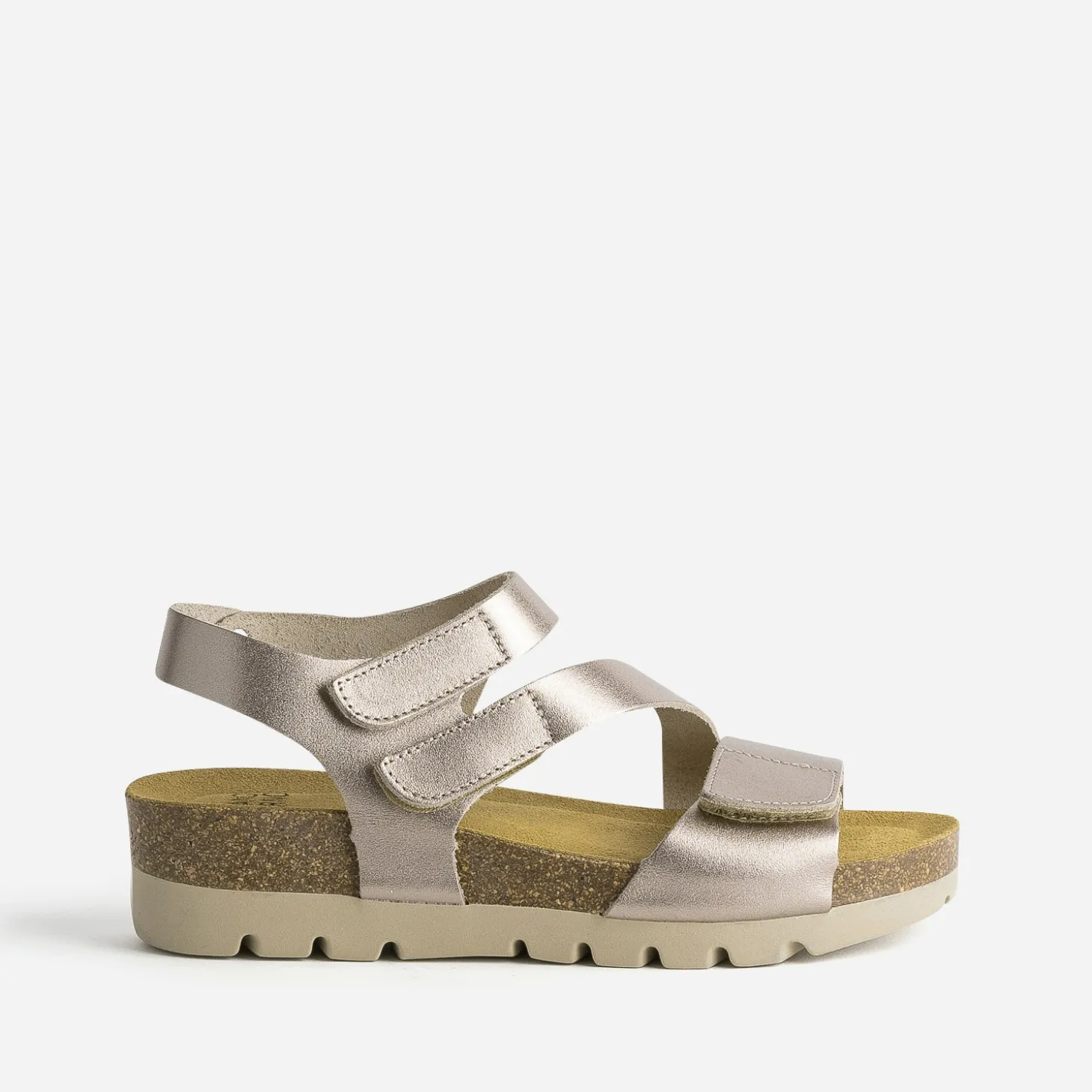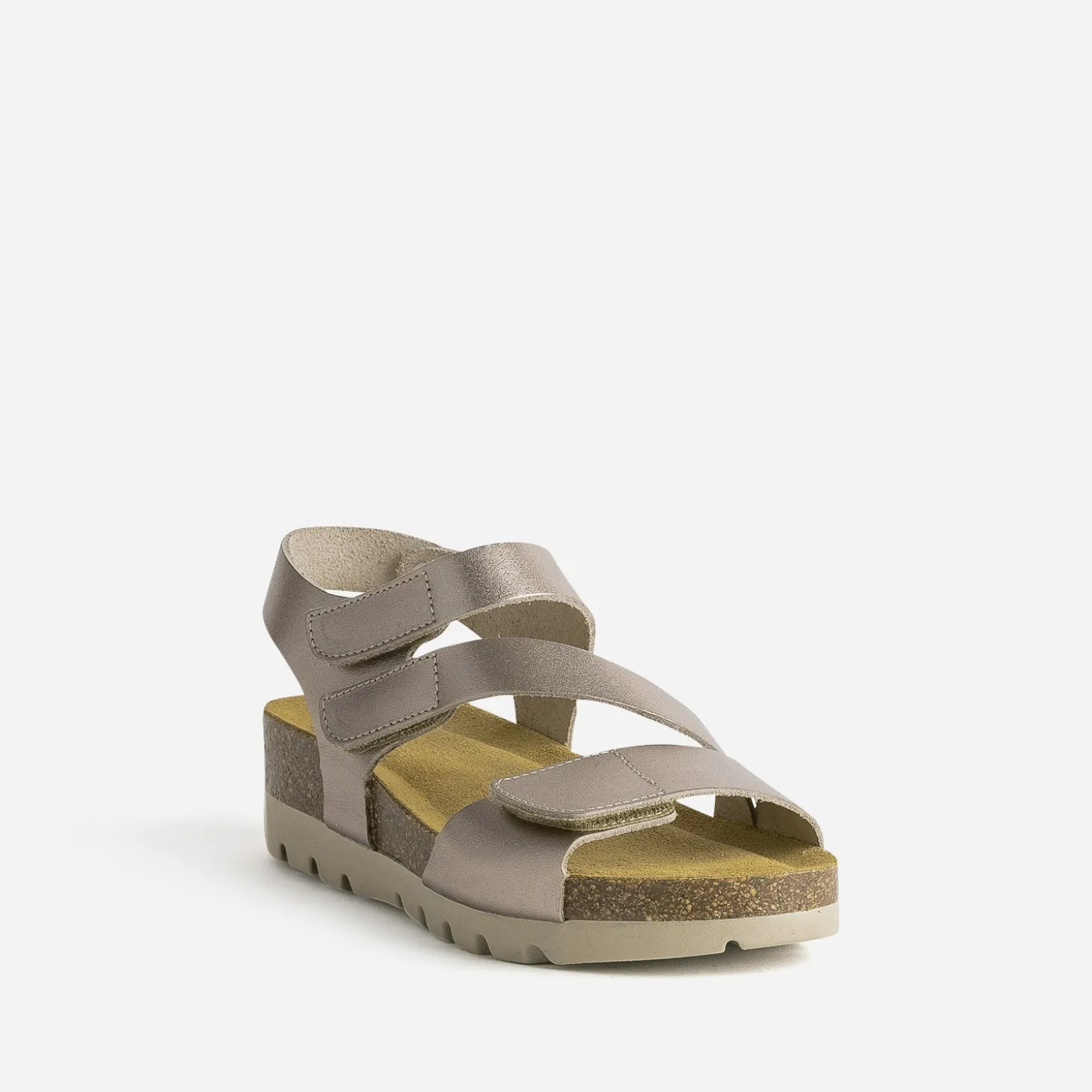 Avez-vous déjà testé la semelle anatomique ? En cuir velours, elle concilie douceur et confort, sans égal. Elle s’affirme comme le point fort de cette sandale pour femme, montée sur un talon compensé de 4 cm. Dessus, 3 brides fantaisie en cuir lisse métallisé doré maintiennent le pied et s’ajustent par scratchs. Essayez avec vos pièces en denim.