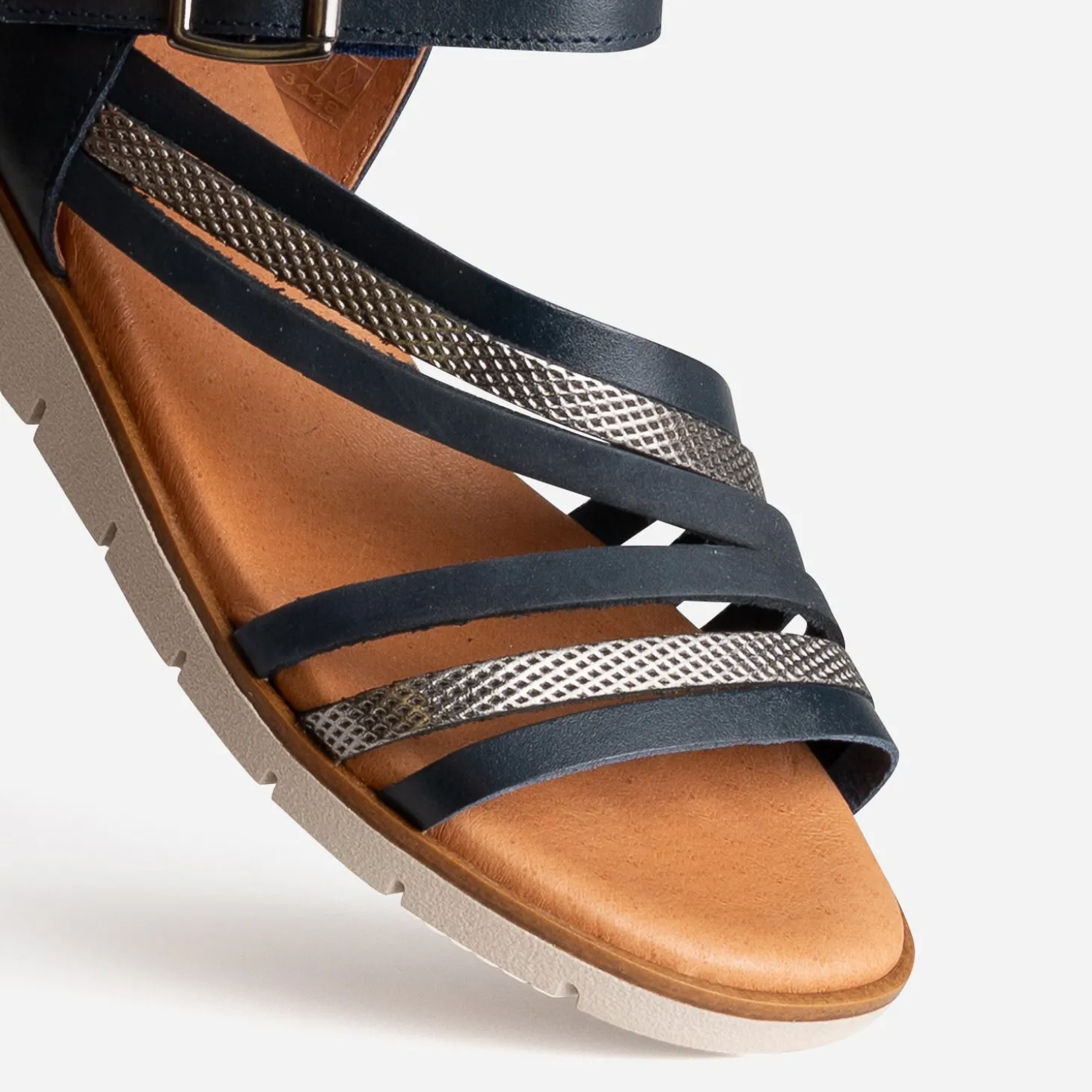 Faites place à la sandale, dès l’arrivée des beaux jours. Préférez un pied parfaitement maintenu, grâce à un jeu de brides multiples ; brides en cuir bleu marine et argentée avec détails embossés. Elle est montée sur une semelle légèrement compensée, très agréable pour marcher au quotidien.