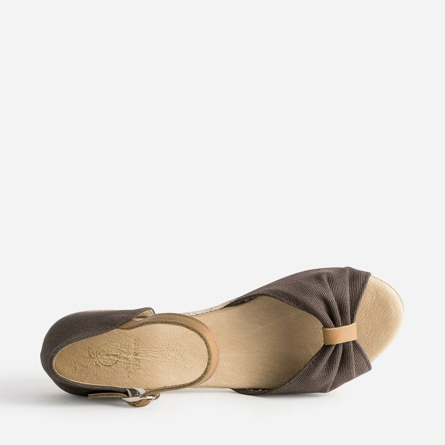 Sandale compensée avec fermeture à boucle. Talon en corde de 4 cm. Bout ouvert et toile marron. Semelle première en cuir. Une jolie sandale pour féminiser les jolies tenues estivales !
