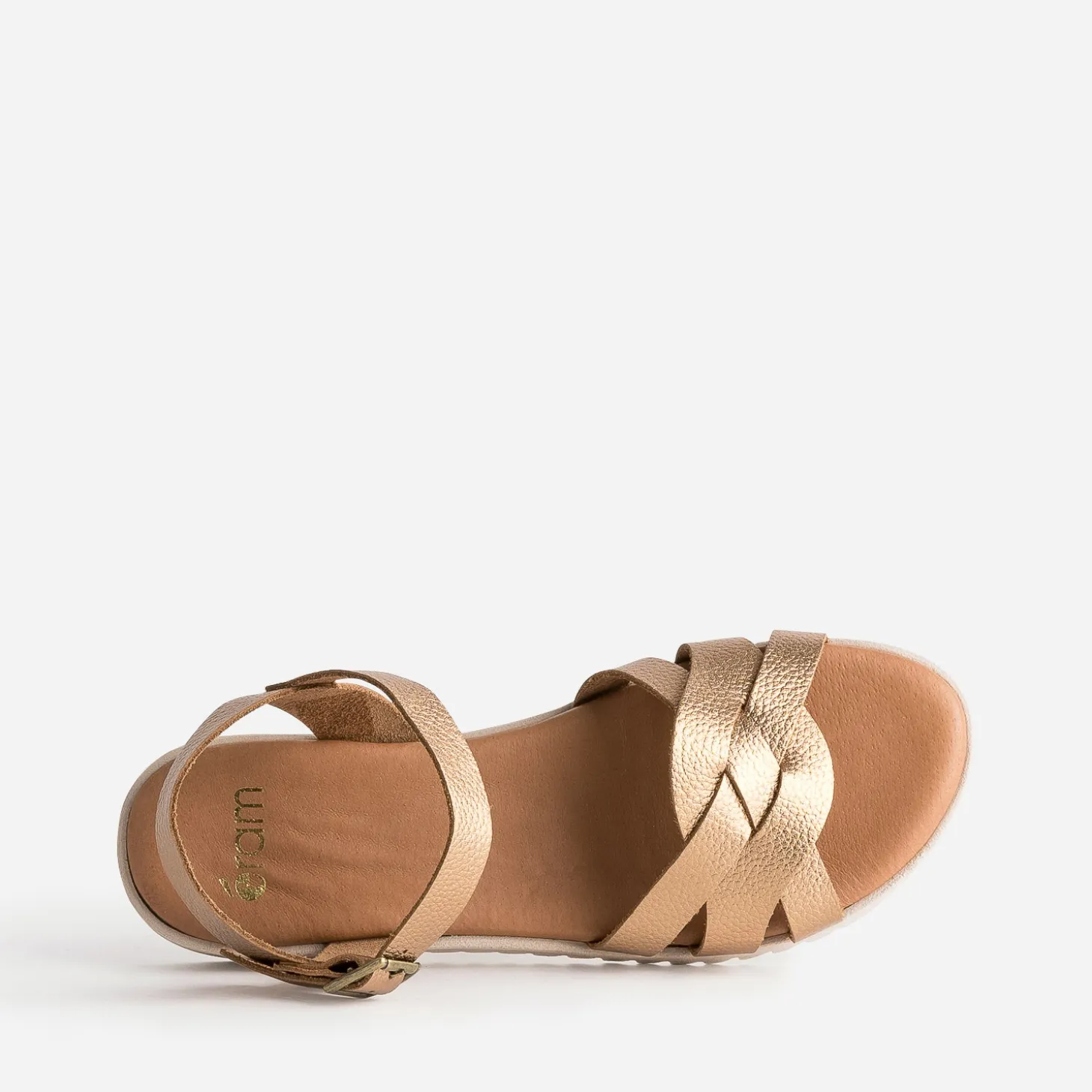 L’idée d’une sandale, qui s’accorde avec tout, est une perspective réjouissante. En cuir marron, avec finition métallisée, celle-ci marque sa singularité par des brides croisées sur le dessus du pied et montées sur une semelle crantée, légèrement compensée. Un modèle idéal, dès l’arrivée des beaux jours, avec des looks plutôt casual.