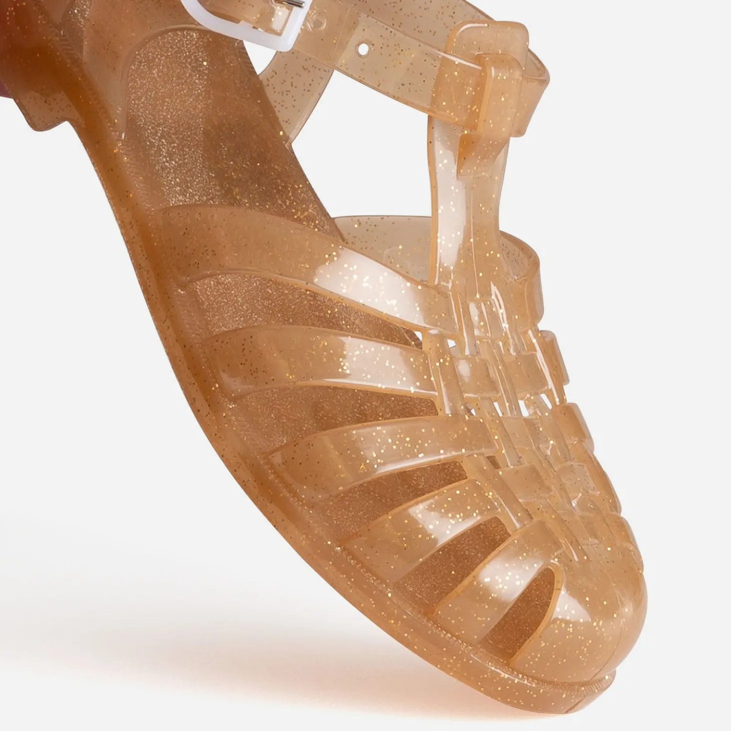 100% fabriquée en France, elle joue l’audace d’un coloris beige, rehaussé de paillettes dorées, et se ferme par une bride à boucle. Un modèle femme qui matche avec toutes les tenues d’été, du bitume jusqu’aux cocotiers !