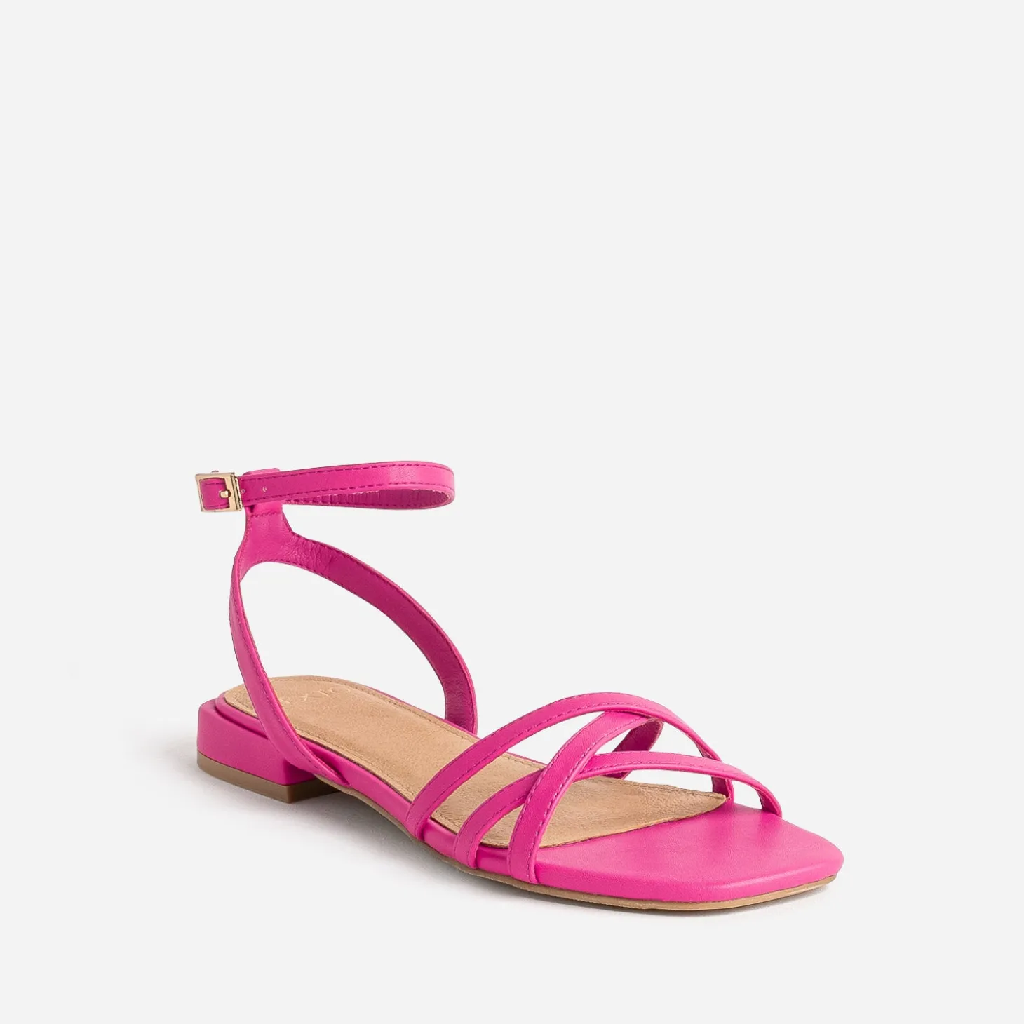 La sandale plate s’offre une nouvelle jeunesse, grâce à un coloris rose fuchsia et une finition mate. Sur le pied, autour de la cheville, les brides se croisent pour un maintien optimal. Avec un look army chic, dans les tons blanc et camel, avec un débardeur, un short en jean et un kimono long, laissez libre cours à vos envies.