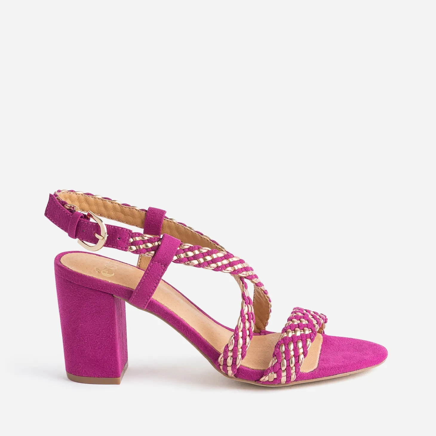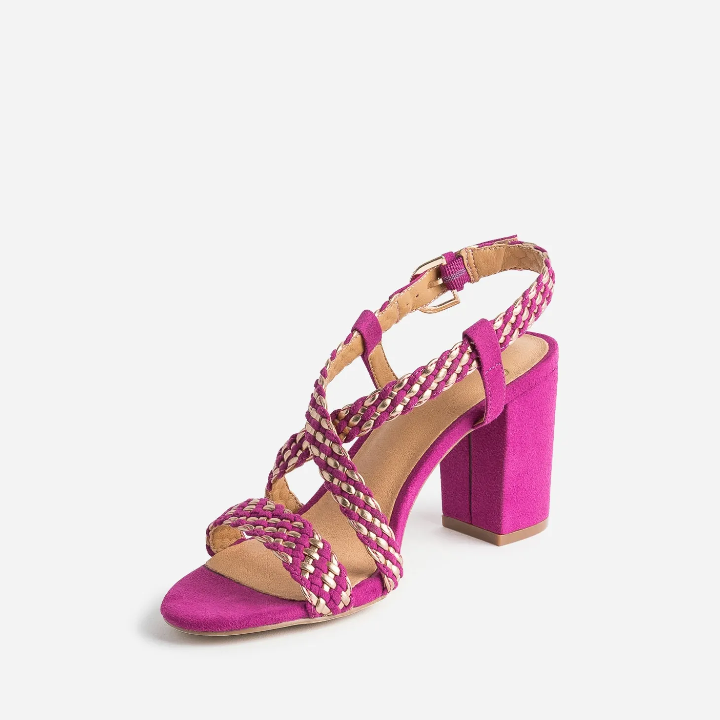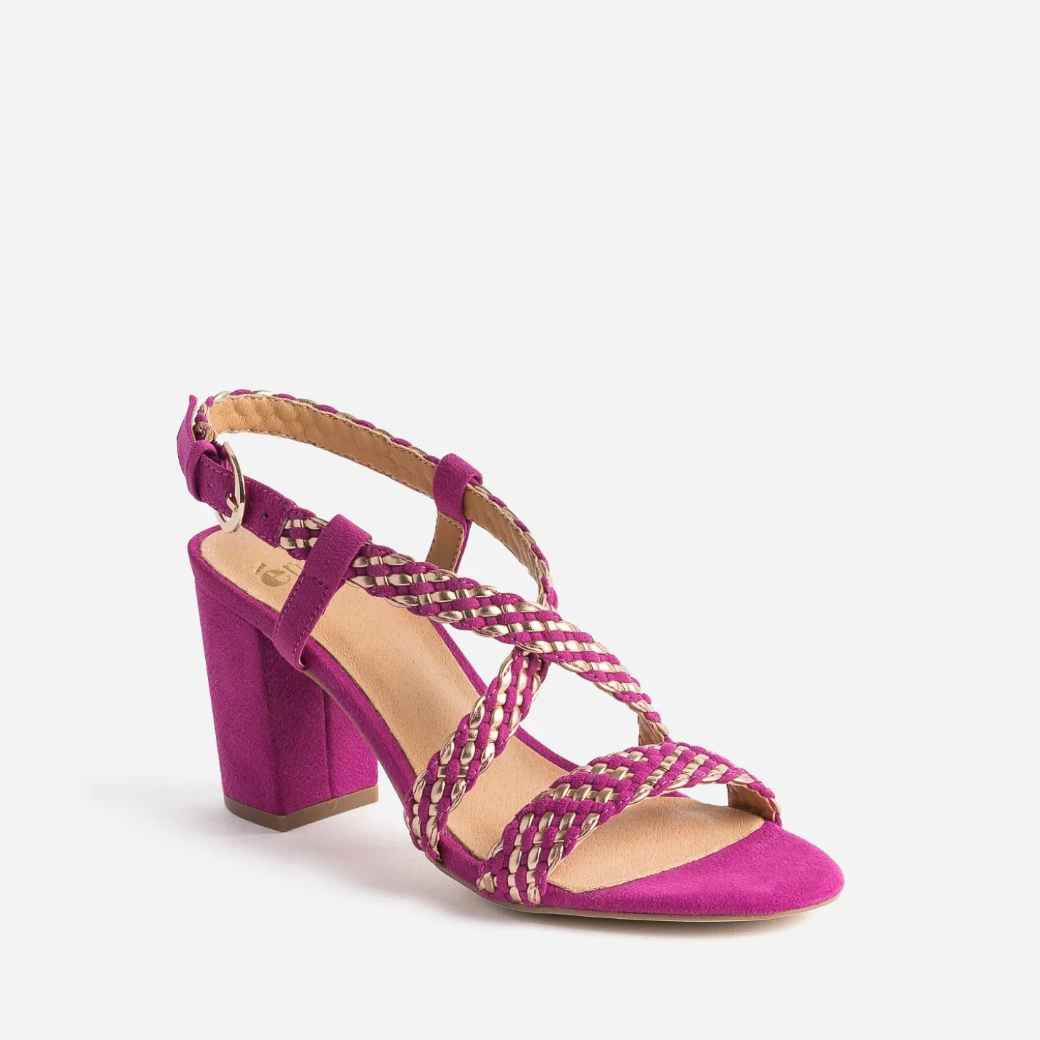 N’attendez plus pour mettre de la couleur à vos pieds ! Cette sandale femme associe un sublime rose foncé à des détails dorés, dans un tressage subtil qui forme les brides. Montée sur un talon de 8 cm, elle s’imagine avec une robe qui tourne et un vernis dans les mêmes tons.
