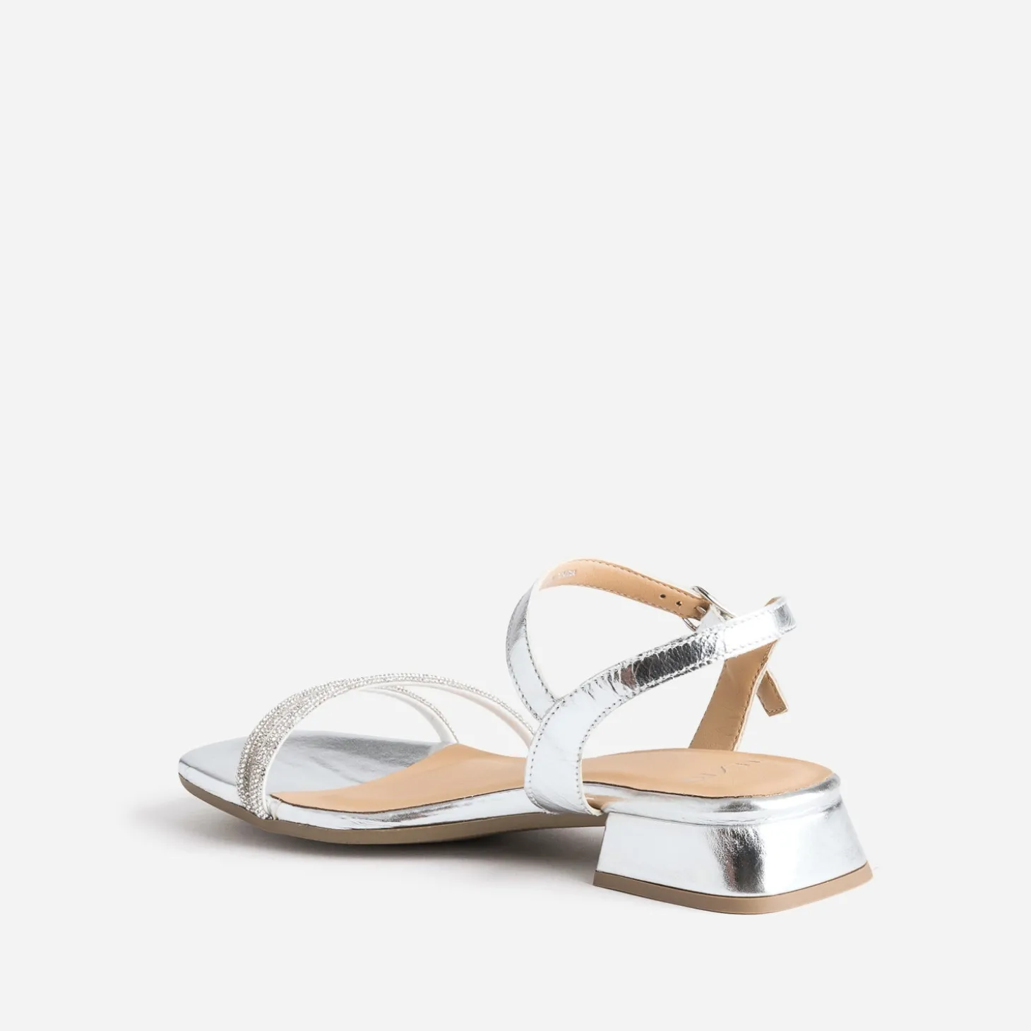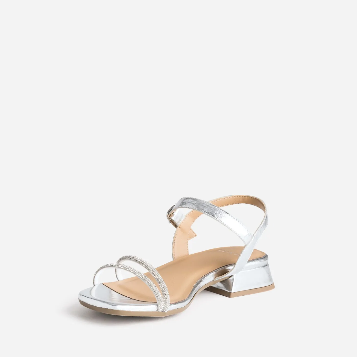 De la brillance, en toutes circonstances, et la tenue se fait chic, chic, chic ! Prenez cette sandale argentée. Elle est montée sur un petit talon, et séduit par sa double bride croisée sur le dessus du pied et recouverte de strass. Réservez-la avec une tenue dans les tons froids, bleu marine ou bleu ciel, vert anis ou vert foncé, prune ou parme.