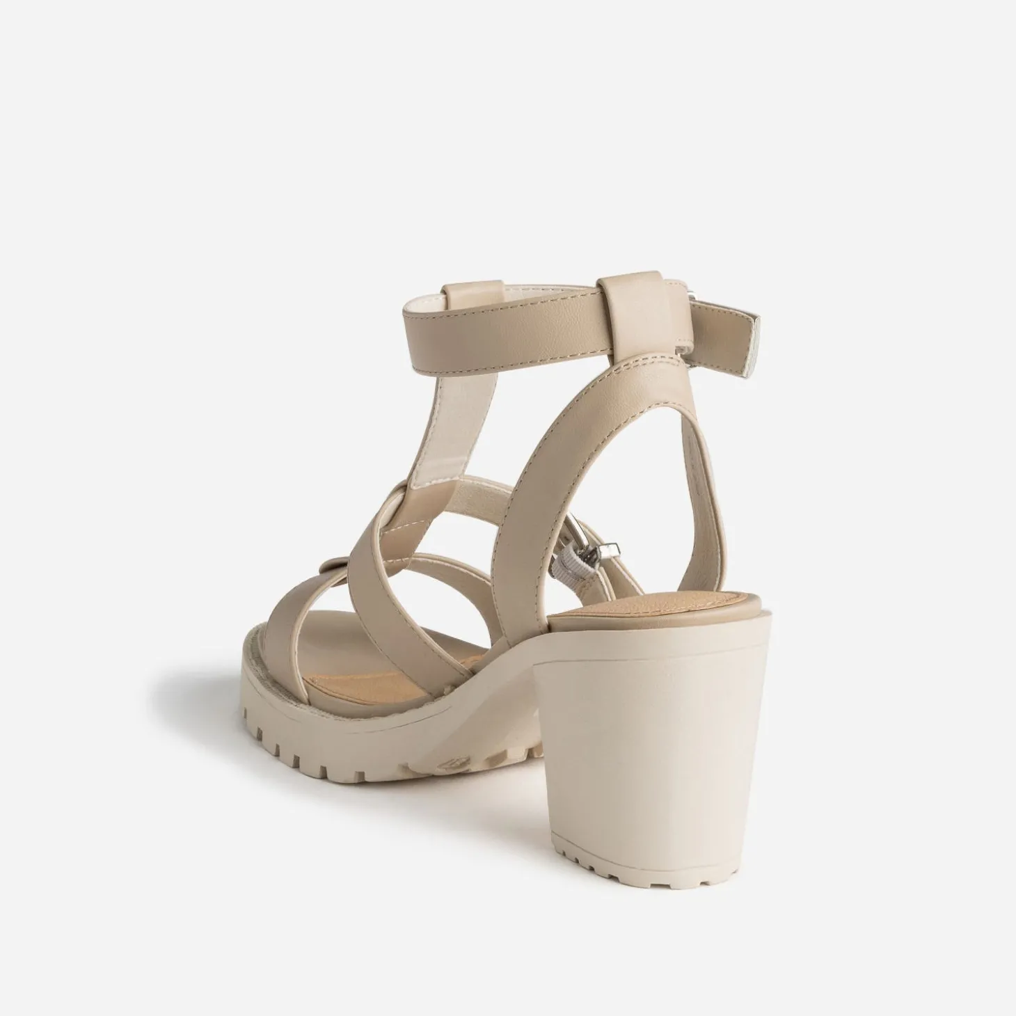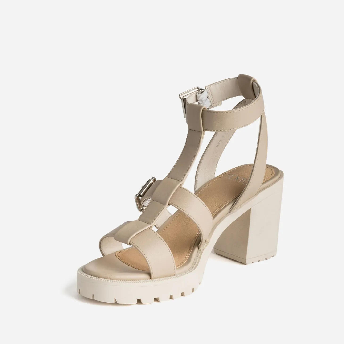 Inspiration désert pour cette sandale femme. Par ses couleurs naturelles, beige foncé sur les brides, beige clair sur la semelle ; une semelle et un talon large, tous les deux crantés, pour une meilleure stabilité. Privilégiez-la avec une combi longue kaki et de gros bijoux argentés, ou bien avec une blouse fluide et un pantalon battle.