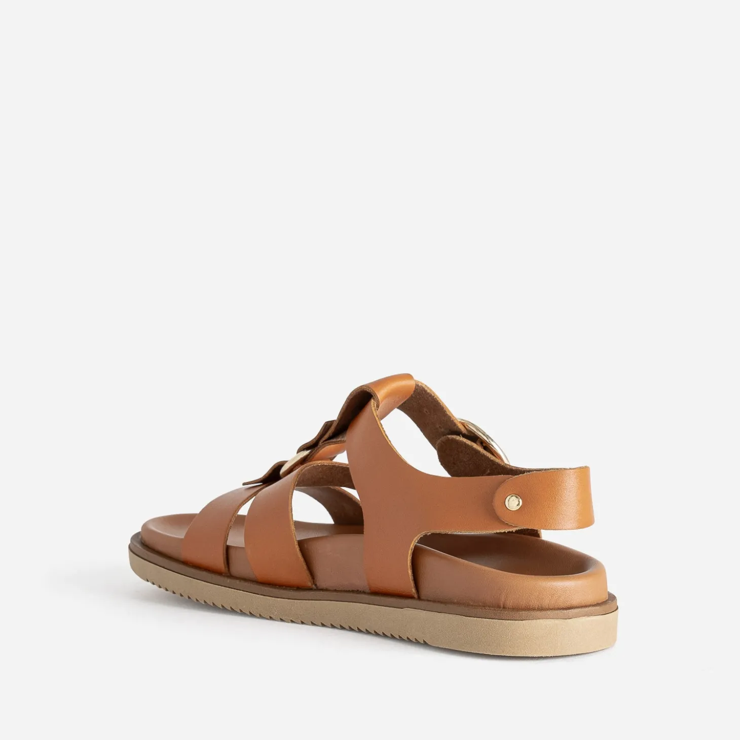 Jeux d’anneaux sur larges brides rondes en métal doré pour cette sandale femme, ultra désirable. Plate, elle est confectionnée en cuir lisse et se décline en coloris cognac. La semelle intérieure séduit par son confort, en lien avec sa largeur et sa souplesse. Associez-la avec tous vos looks d’été, longue robe tube noire ou top et pantalon en macramé beige.