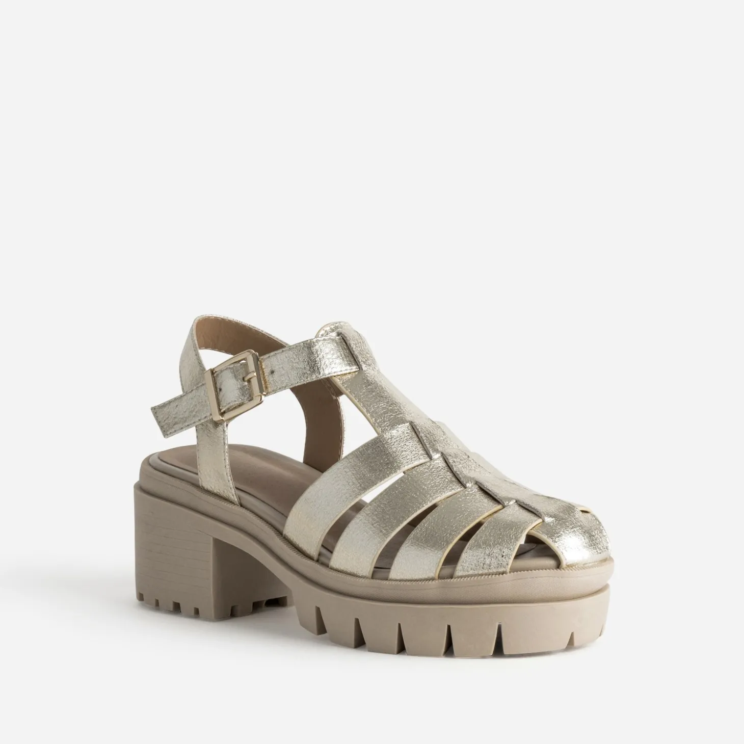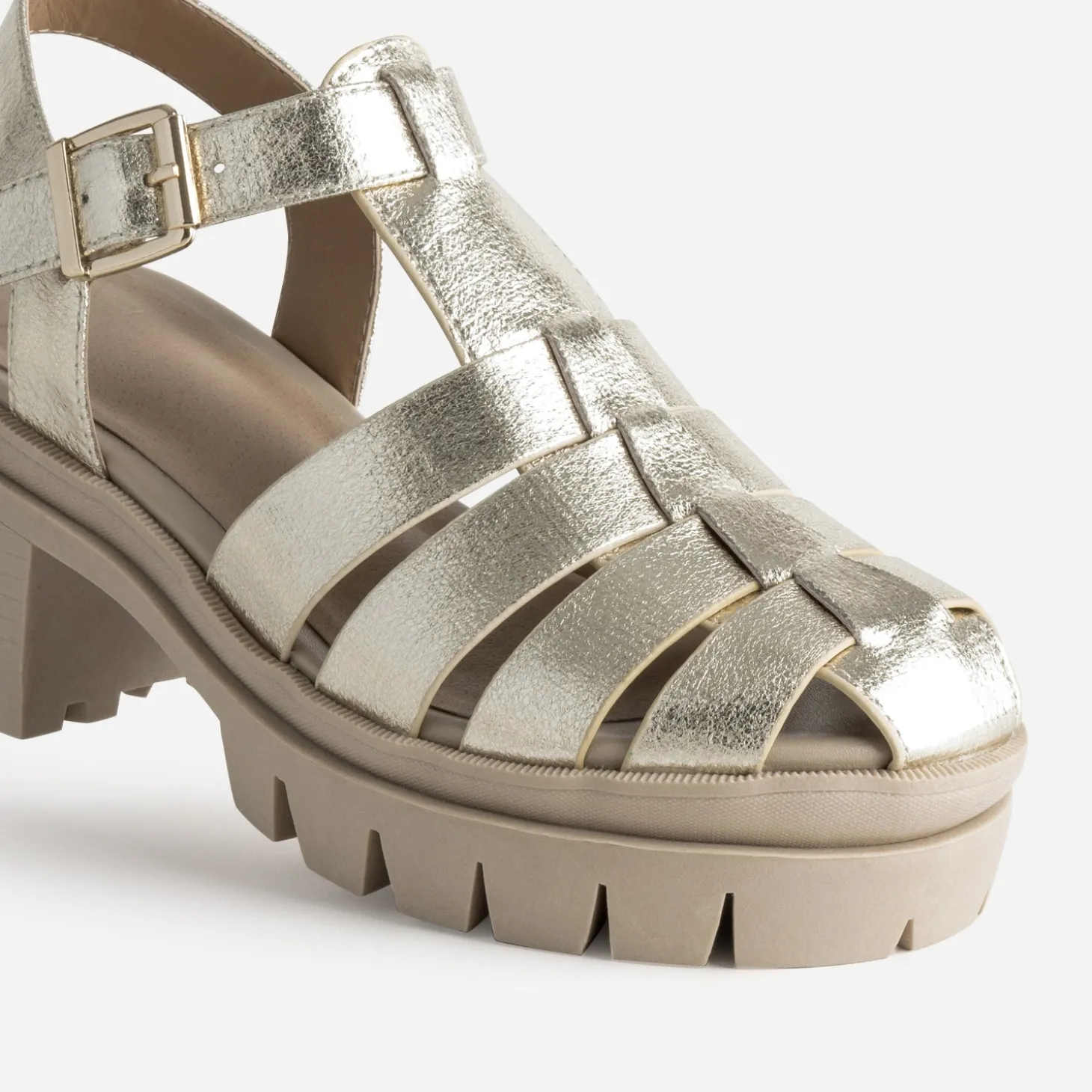 Plus massive, plus brillante, cette sandale femme s’inscrit dans la tendance actuelle. En matière synthétique, elle opte pour une forme fishermann, reconnaissable à ses multiples brides, et montée sur une semelle épaisse et crantée. Elle se décline dans un coloris métallisé doré, idéal pour apporter une touche casual chic aux looks du quotidien. Un modèle à associer avec un top fluide rouge corail et un jean large écru.