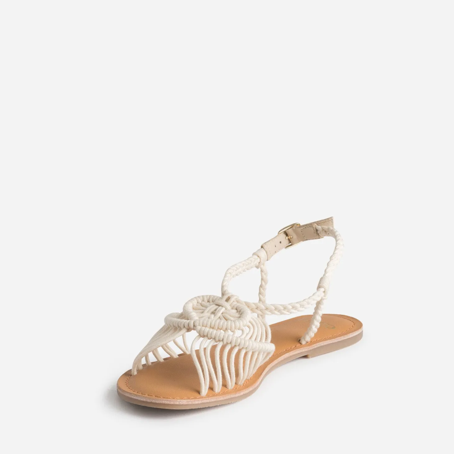 Style bohème est une tendance intemporelle, qui marque la saison estivale. Sur cette sandale plate pour femme, la bride principale est revisitée par un tissage en textile écru façon macramé, prolongé par une tresse autour de la cheville. Idéale avec une robe en broderie anglaise blanche, avec un panier en raphia en guise de sac à main.