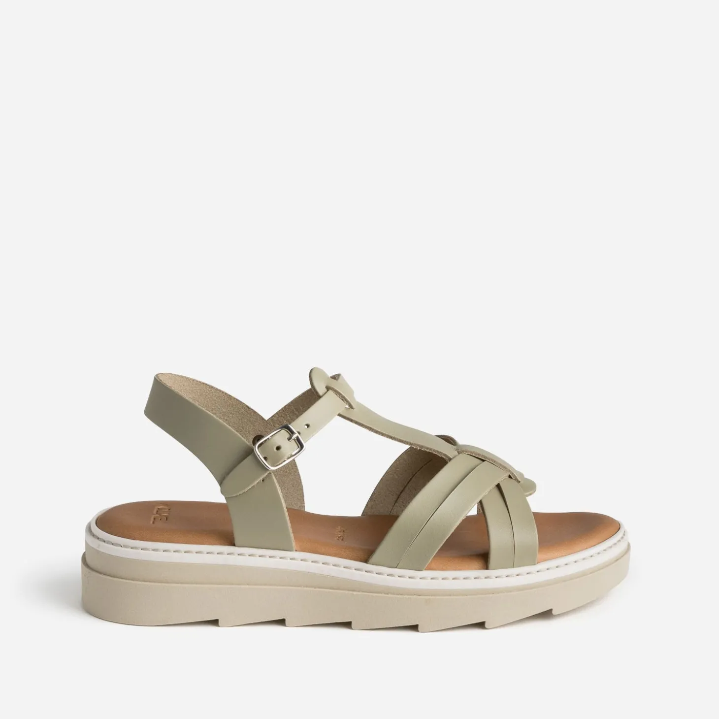 Le kaki s’invite dans l’été, par une variation plus claire. En cuir, cette sandale femme séduit par ses doubles brides croisées sur le dessus du pied. Elle est mise au goût du jour par une semelle épaisse beige, sous trépointe bicolore. Avec, privilégiez des teintes naturelles, comme le blanc, le beige, le camel et le marron, et pourquoi pas, un motif camouflage.