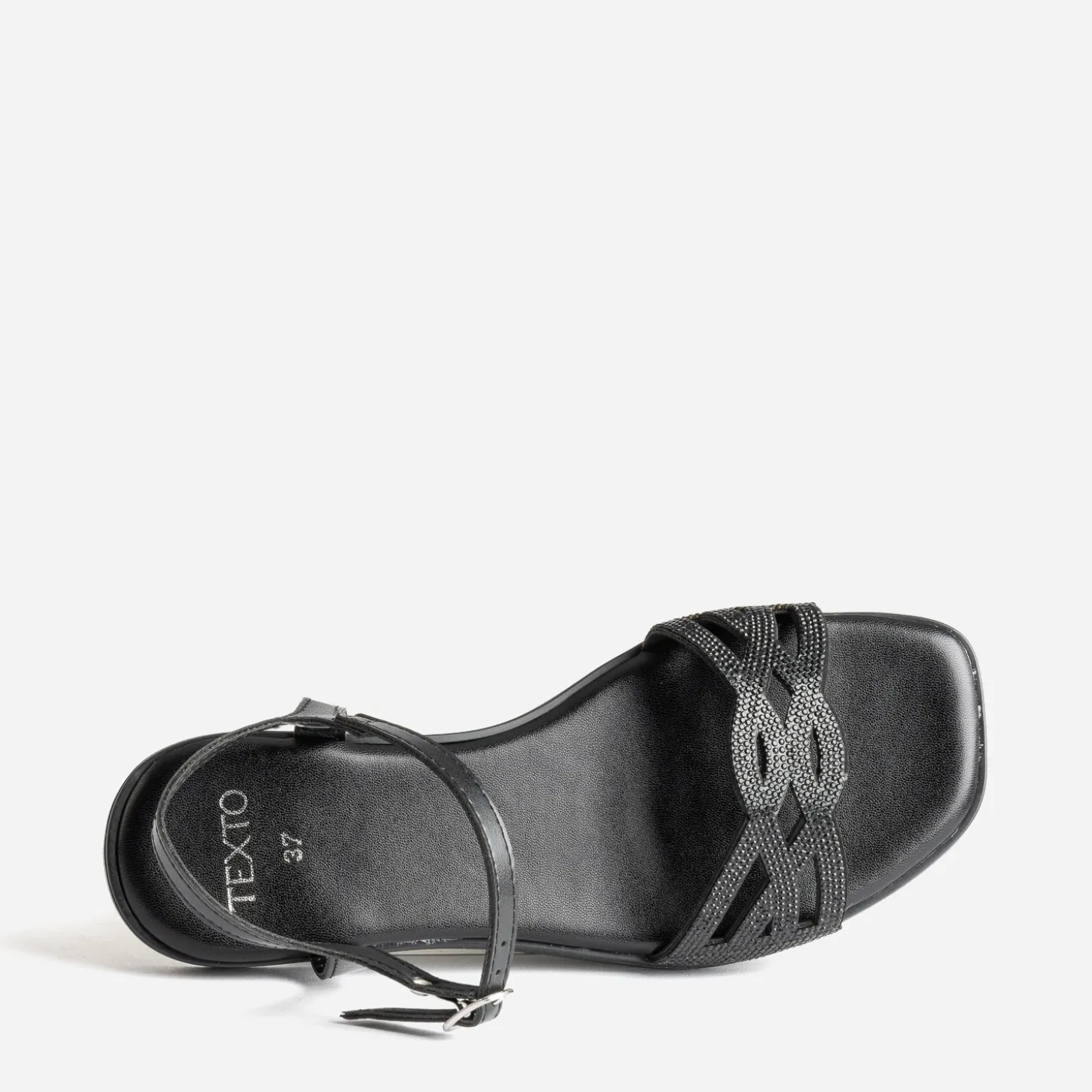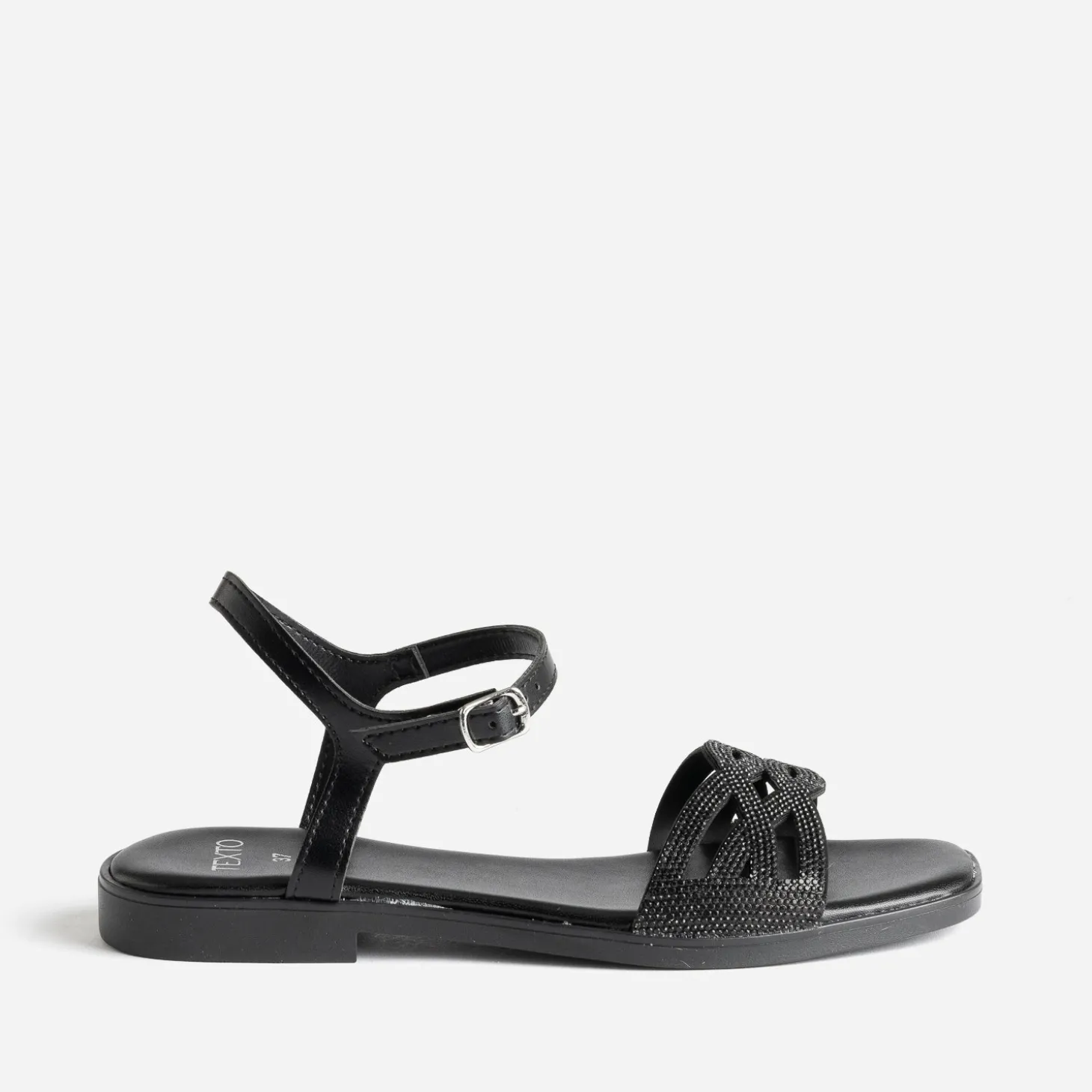 Une jolie sandale aux détails raffinés, et c’est toute la tenue qui gagne en chic. Plate, ce modèle noir présente une bride faite d’entrelacs et rehaussée de strass ton sur ton. Misez sur un total look black, costume-pantalon ou combi.