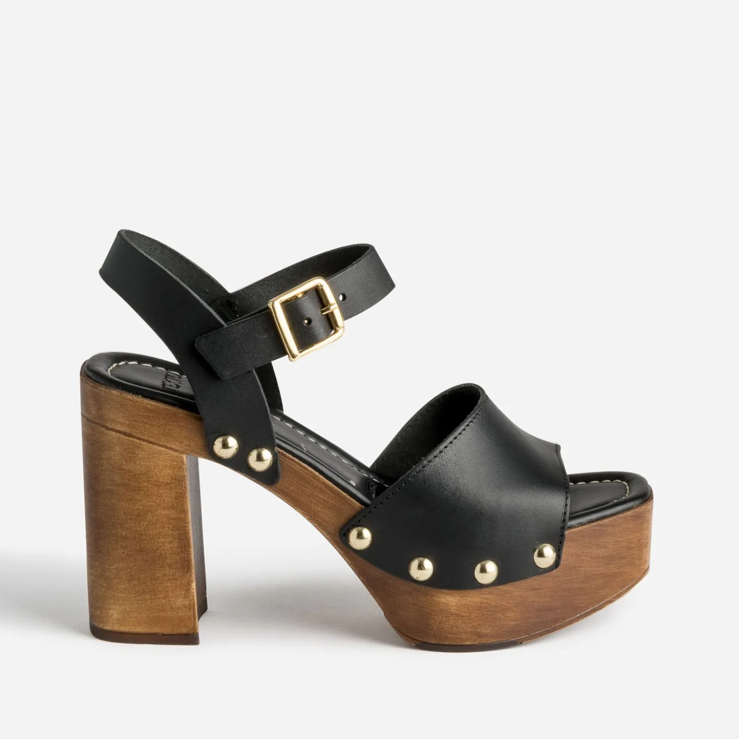 10,5 cm de talon à l’arrière. 3,5 cm de patin à l’avant. Cette sandale pour femme adopte toute l’audace des seventies, par une semelle imitation bois foncé. En cuir noir, la large bride à l’avant et la bride cheville sont maintenues par des clous en métal doré sur les côtés. Allongez encore votre silhouette, avec un top fluide à lavallière, un pantalon flare et une belle capeline.