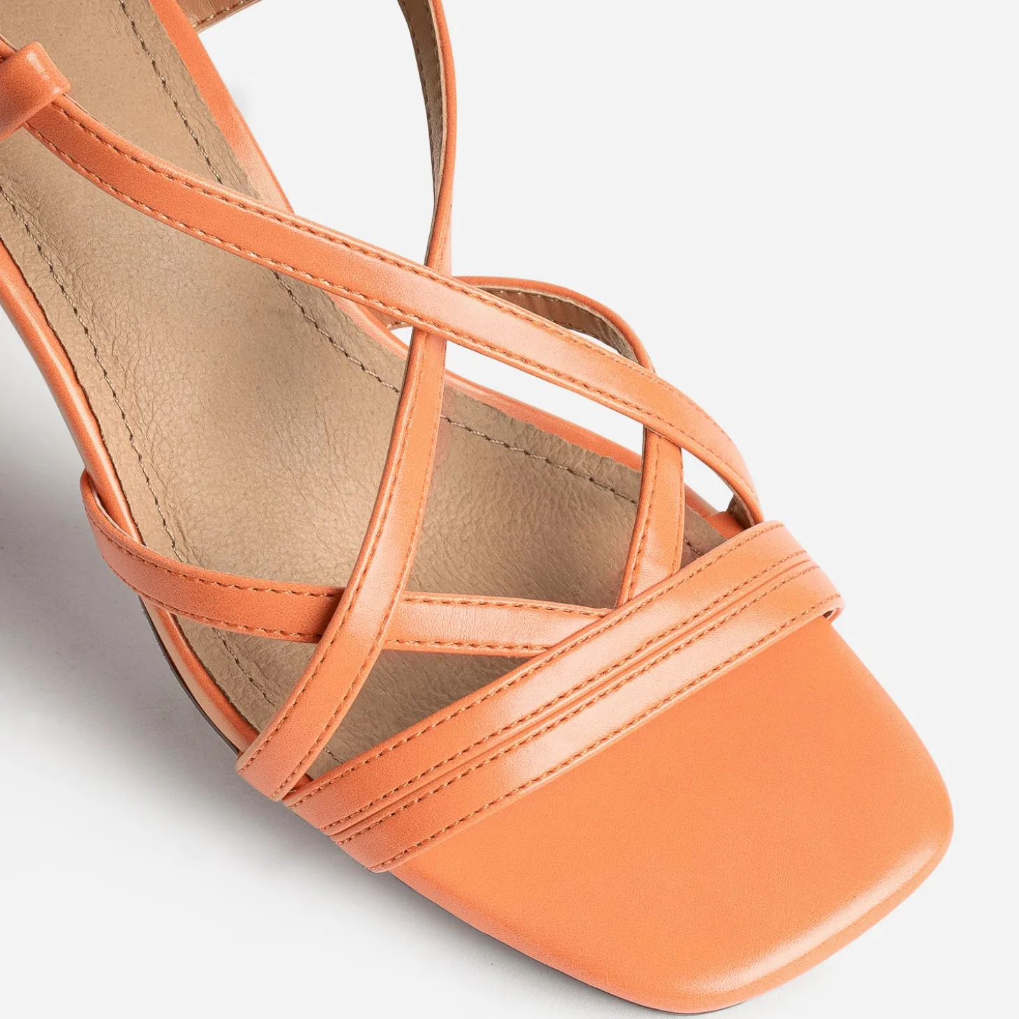 Mettez de la couleur à vos pieds. Et vos tenues passent instantanément en mode été ! En matière synthétique lisse, cette sandale femme se décline en coloris orange mandarine. Le jeu de fines brides est mis en valeur par un bout carré et un talon flare de 6,5 cm. Pour une cérémonie avec une robe à imprimé fleuri, ou pour le quotidien avec un top blanc et un pantalon fluide vert foncé ou parme, elle s’adapte à toutes les envies.