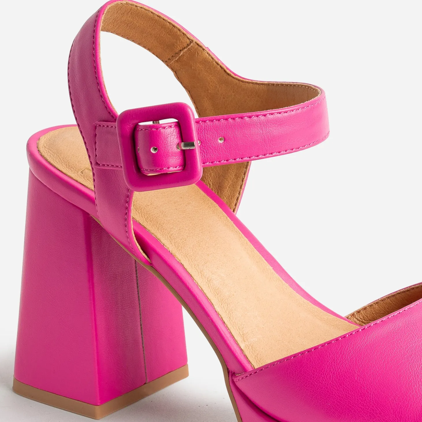 De la couleur, oui ! Mais pas n’importe quelle couleur. Option rose fuchsia validée pour cette sandale femme, qui va assurément faire les beaux jours de vos looks d’été. Inspiration rétro, elle est montée sur un talon flare de 9 cm et une plateforme avant de 2 cm, le tout soulagé par une semelle première moussée. De son bout carré jusqu’à la boucle recouverte, la finition mate apporte une vraie touche de modernité. Vous hésitez ? Essayez-la avec du bleu canard ou du vert anis, du prune ou du vert cèdre.