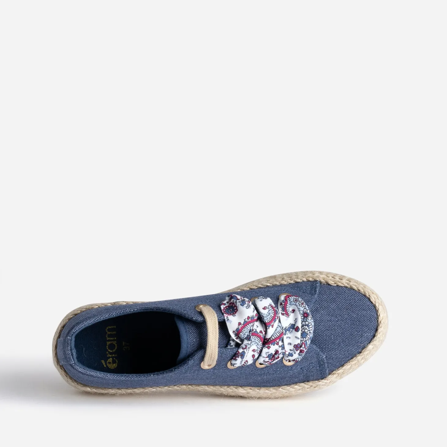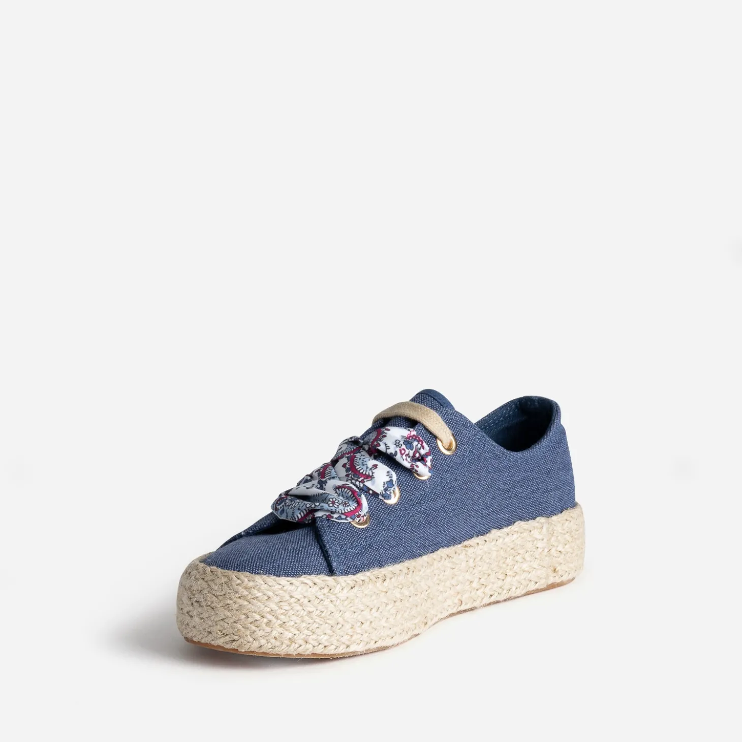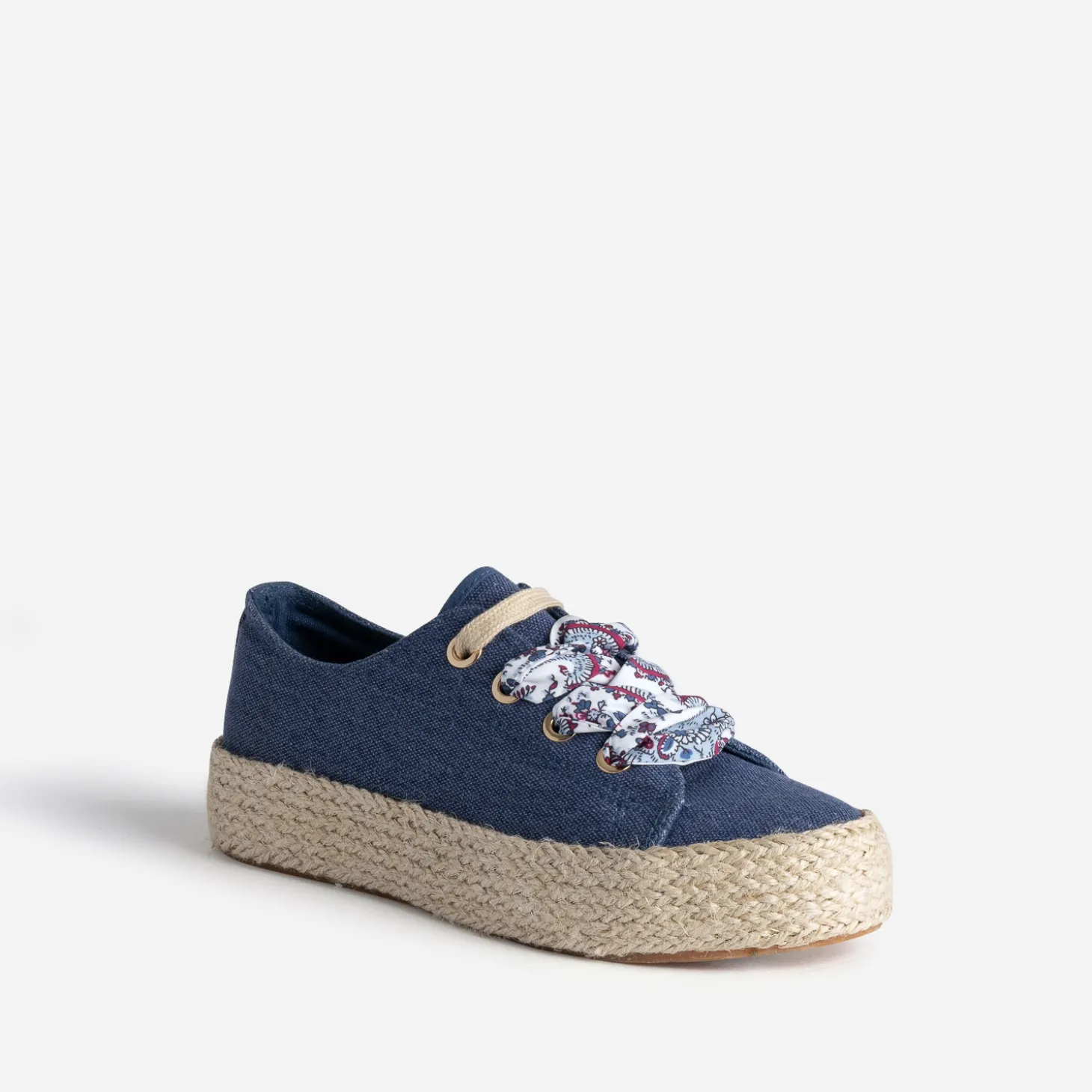 Mi-tennis mi-espadrille, cette sneakers s’invite dans votre shoesing d’été. En toile bleue, elle se démarque par un effet pailleté et est montée sur une semelle à plateforme de 3 cm recouverte de corde. Sa particularité : elle est livrée avec deux lacets, l’un plat de couleur beige, et l’autre façon foulard, rythmé d’un imprimé cachemire. Portez-la au quotidien avec un jean boyfriend de couleur et un sweat à message.
