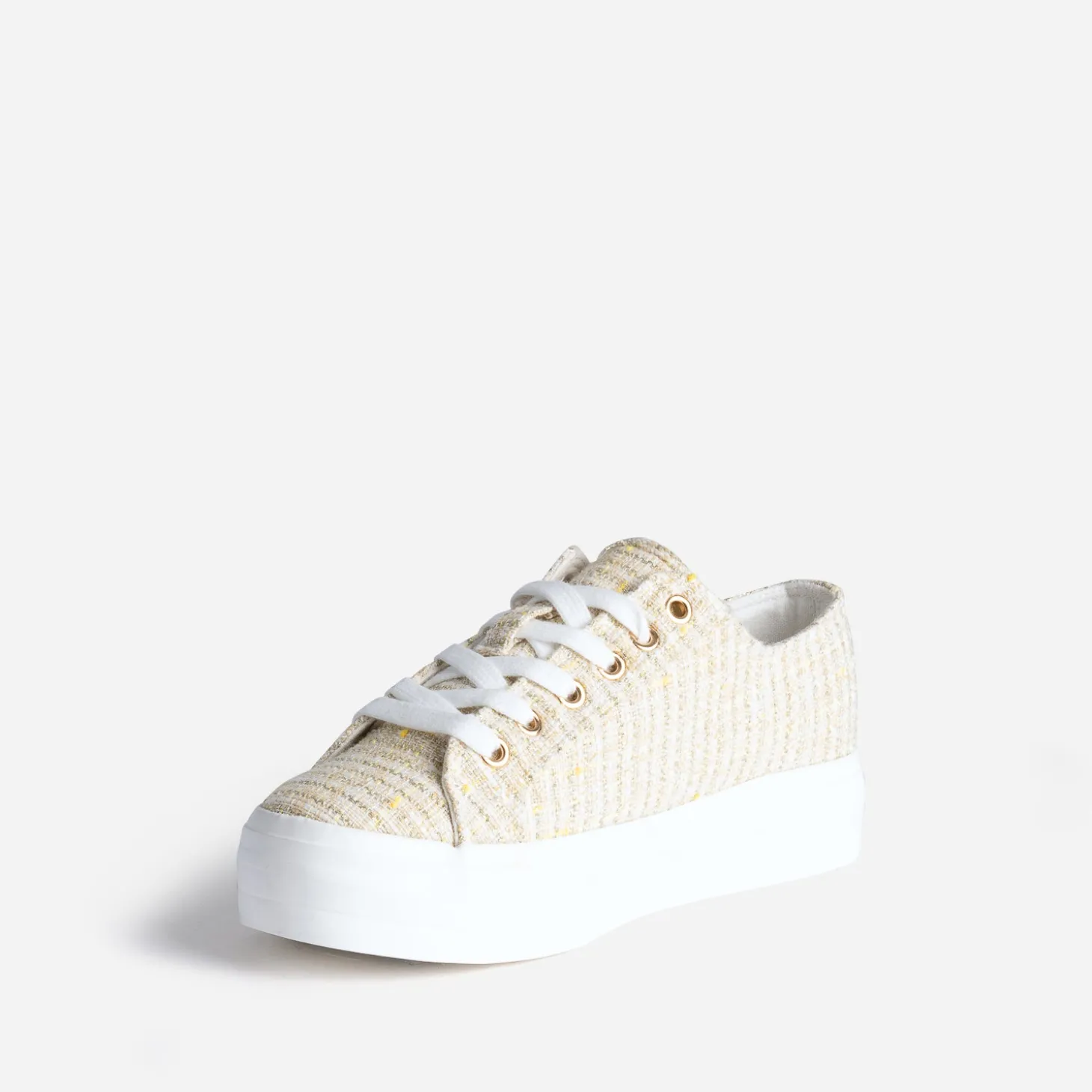 Ce beige là, il est parfait. Inspiré du tweed, il assure des looks décontractés. La tennis femme associe toile et semelle épaisse blanche, pour s’inscrire dans la tendance du moment. Un modèle à privilégier à l’entre saison, avec un tee-shirt, un jean cropped et une veste en jean.