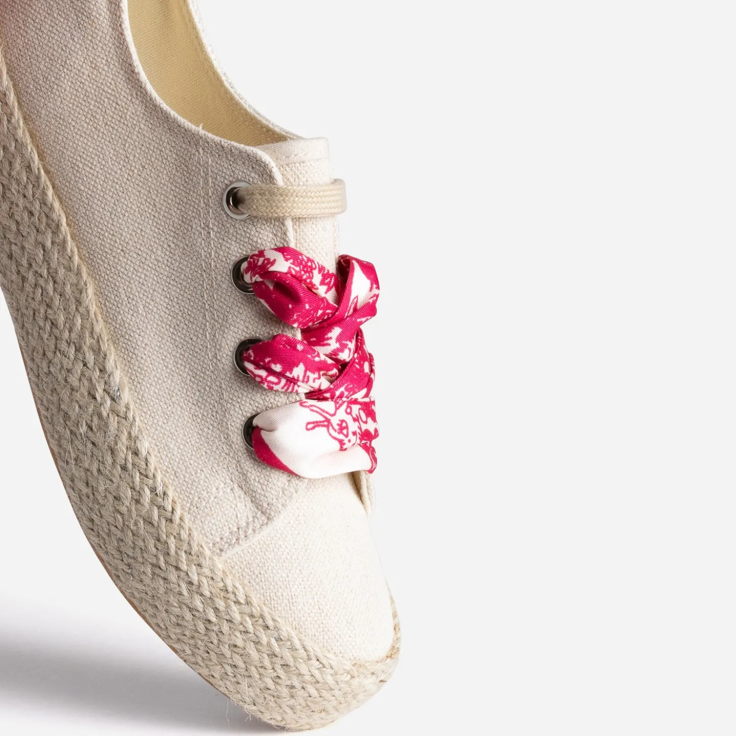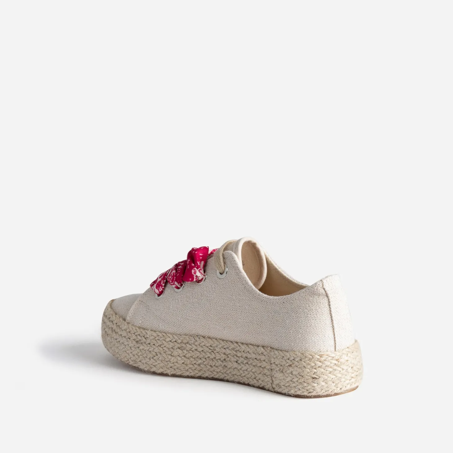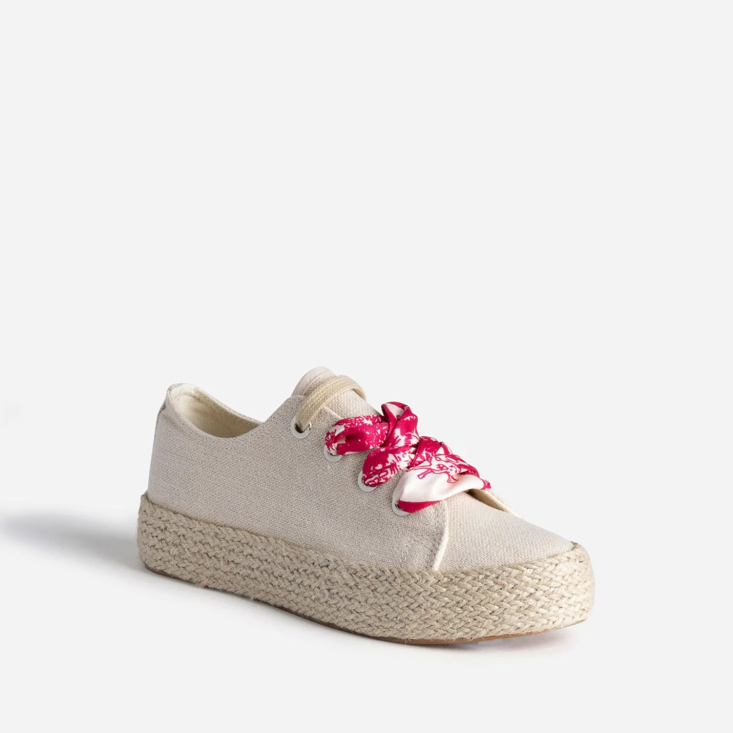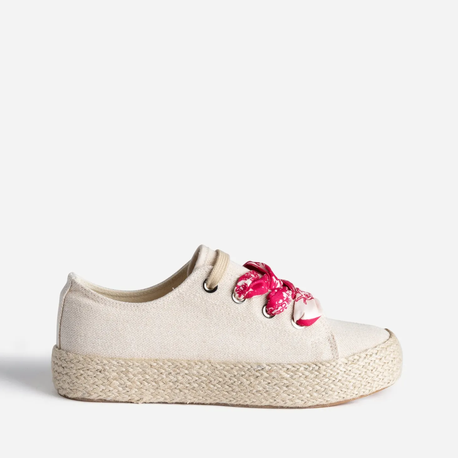 Mi-tennis mi-espadrille, cette sneakers s’invite dans votre shoesing d’été. En toile beige, elle se démarque par un effet pailleté et est montée sur une semelle à plateforme de 3 cm recouverte de corde. Sa particularité : elle est livrée avec deux lacets, l’un plat de couleur beige, et l’autre façon foulard, rythmé d’un imprimé rose façon toile de Jouy. Portez-la au quotidien avec un jean boyfriend de couleur et un sweat à message.
