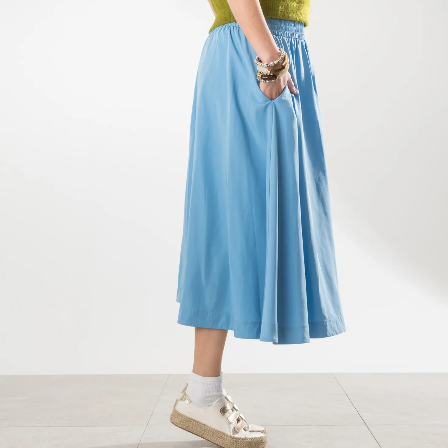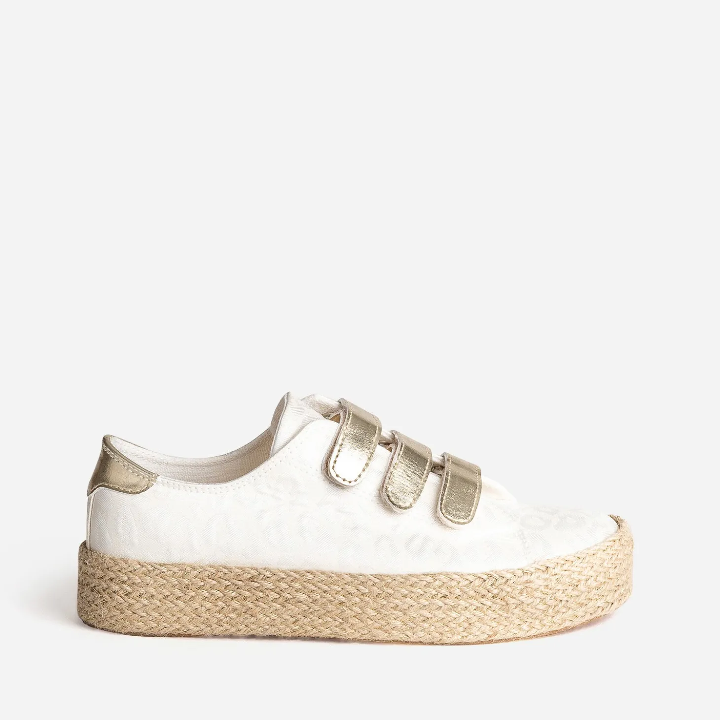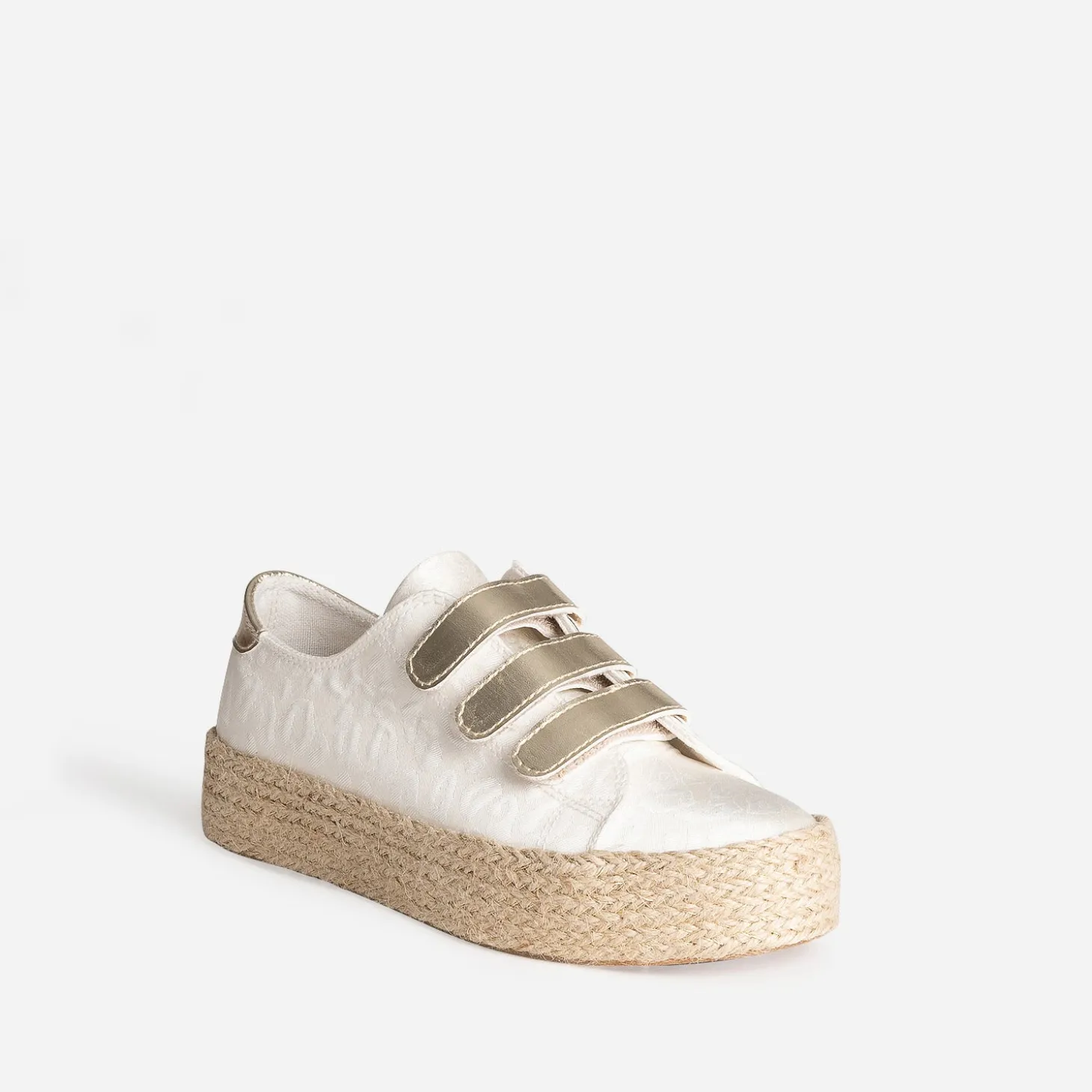 Tige inspiration tennis, semelle inspiration espadrille : faites de la place pour cette sneakers, parfaite pour le printemps. En textile blanc cassé, elle se démarque par un jacquard à motif léopard et une semelle à plateforme de 3 cm recouverte de corde et de fils dorés. Sa particularité : elle se ferme par trois scratchs dorés. Un modèle à porter au quotidien, avec un top blanc, un jean cropped bleu et une ceinture marron.