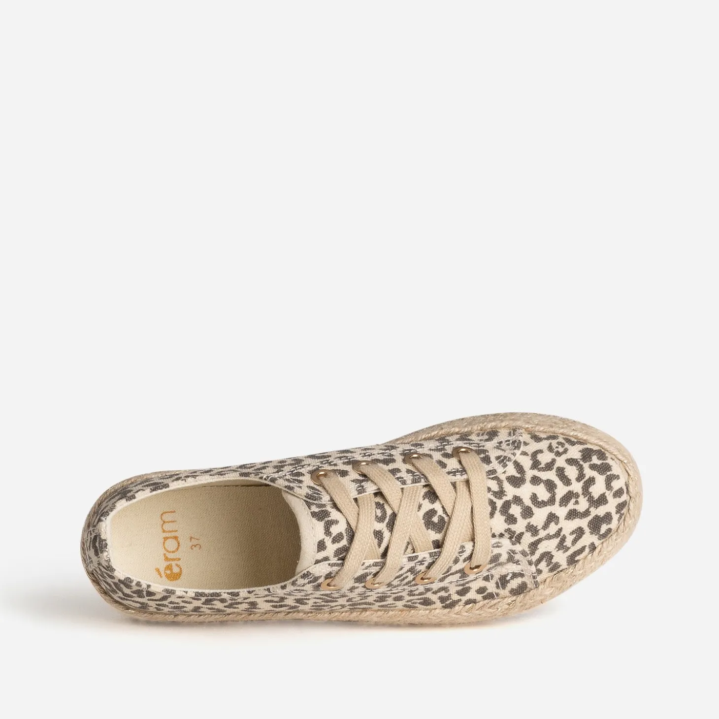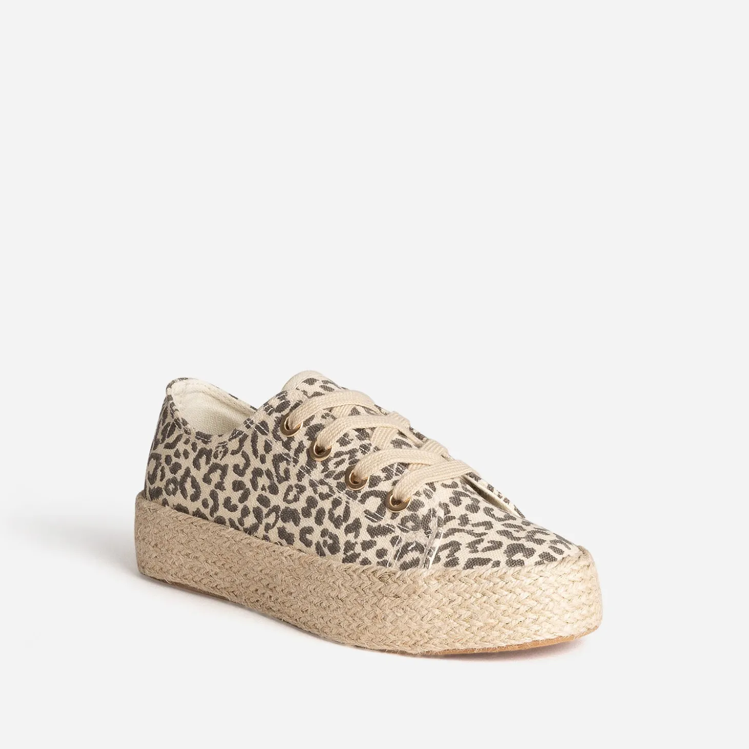Mi-tennis, mi-espadrille, cette sneakers s’invite dans votre shoesing d’été. En textile beige, elle est sublimée par un imprimé effet léopard, LA tendance phare. Elle est montée sur une semelle à plateforme de 3 cm recouverte de corde et de fils dorés. Un modèle à porter au quotidien, avec un pantalon chino beige et un débardeur blanc.