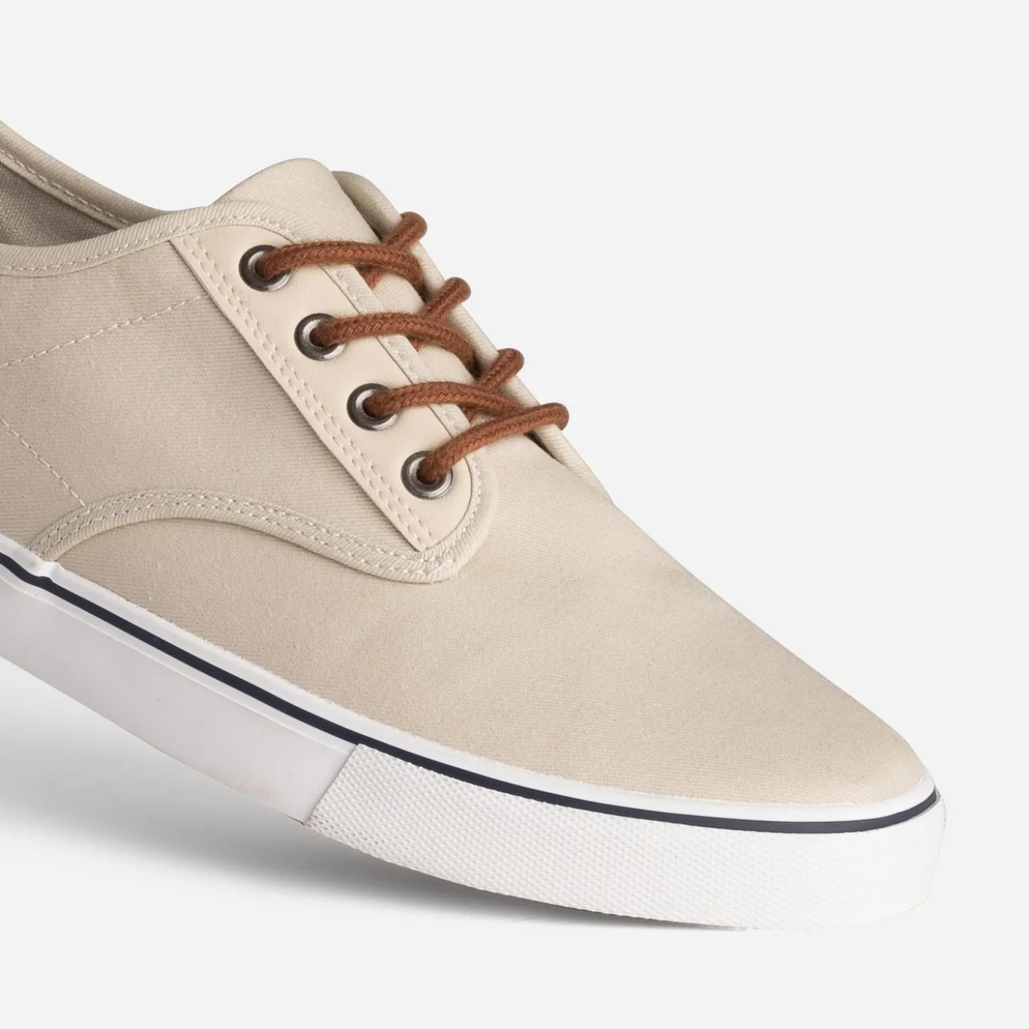 Parmi les chaussures incontournables, la tennis en toile pour homme confirme son statut mode, au fil des étés. Son design simple et son coloris beige en font un modèle intemporel, qui dure saison après saison. Le lacet marron répond au contrefort, et la semelle est soulignée d’une touche de bleu marine. Un modèle à abuser sans modération, dans vos looks de week-end ou de vacances.