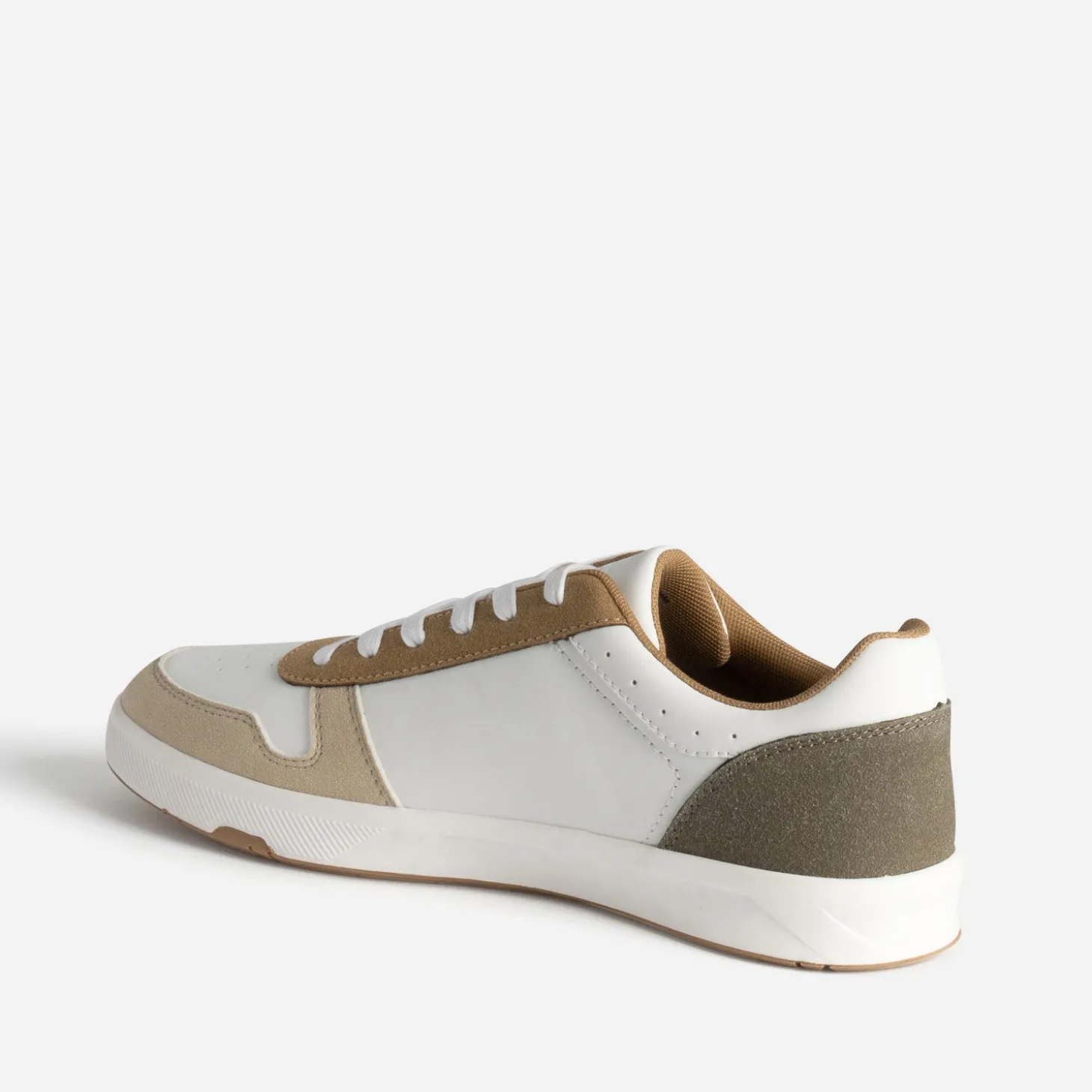 Matière synthétique lisse blanche, matières synthétiques suédées beige, camel et kaki, doublure camel : cette tennis pour homme s’inscrit dans une tendance sportswear modérée. Elle se porte facilement avec un tee-shirt blanc et un pantalon chino beige, pour un look du quotidien.