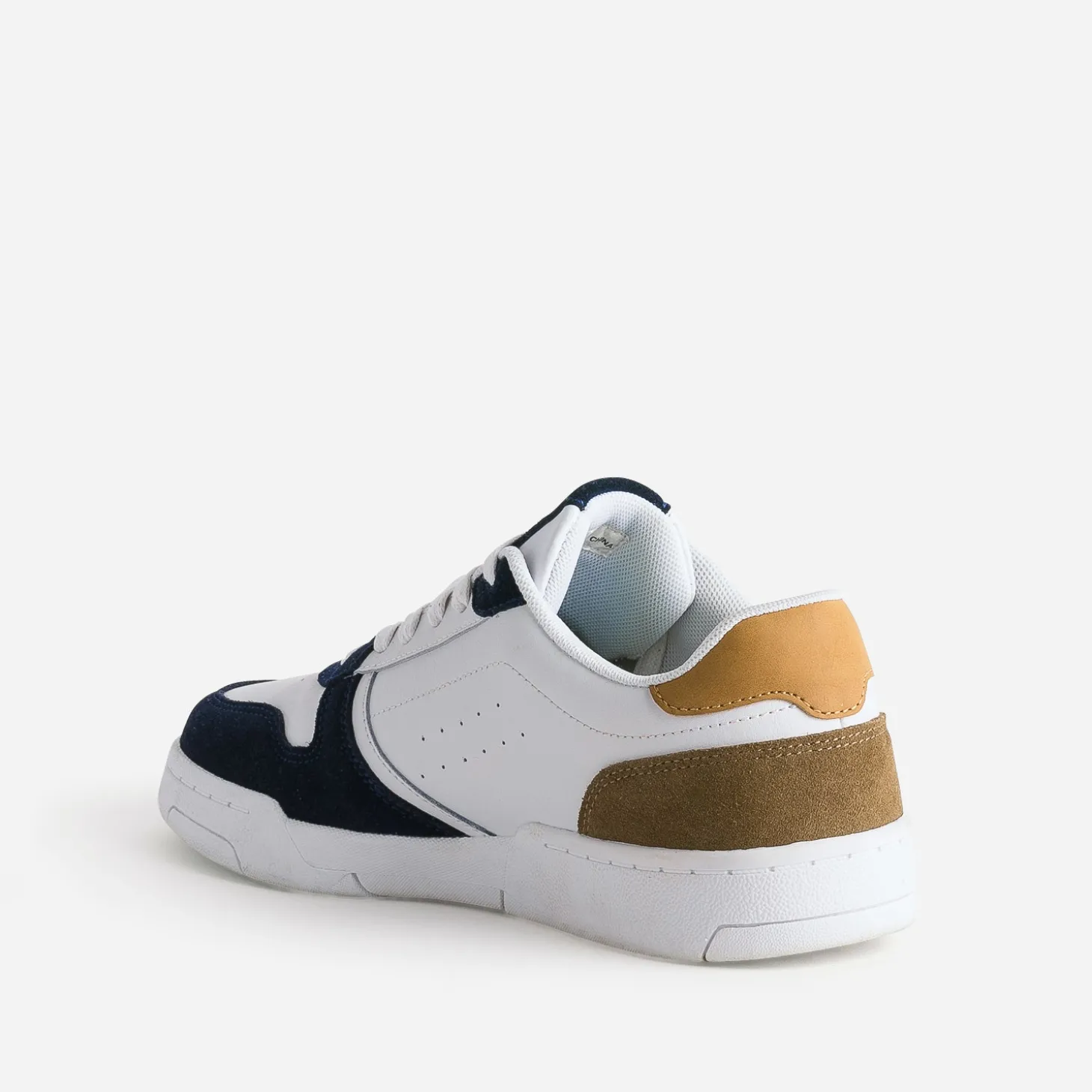 https://www.eram.fr/homme/chaussures-homme/chaussure-blanche-homme.htmlL’iconique tennis blanche s’autorise des touches de couleurs sobres. Sur le bout, en cuir velours marine d’une part. Sur les contrefort, en cuir lisse et velours beige, d’autre part. Un modèle relativement simple, qui traverse les modes sans se démoder, en s’accordant facilement avec vos tenues du quotidien.