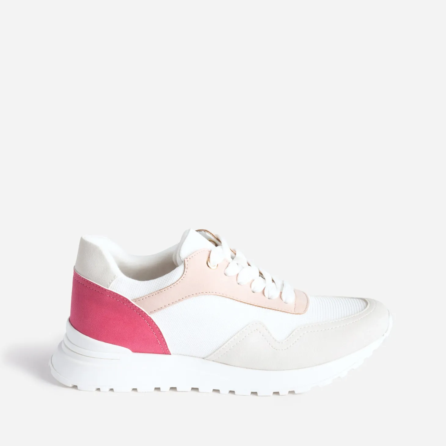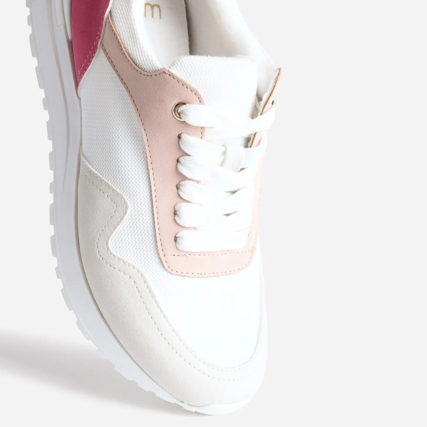 La tennis change de tonalités, en vue d’un parfait matchy-matchy avec l’été. Les couleurs se veulent plus douces : ici, le blanc cassé s’associe au rose poudré, gris clair et rose fuchsia. Les matières s’allègent : le mesh accueille des empiècements en matière synthétique suédée. La semelle intérieure est amovible et la semelle, crantée et légèrement compensée, les deux offrant un vrai confort et une adhérence sur tous les sols. Tee-shirt blanc sur jupe longue pastel plissée : l’uniforme validé dès l’entrée de saison.