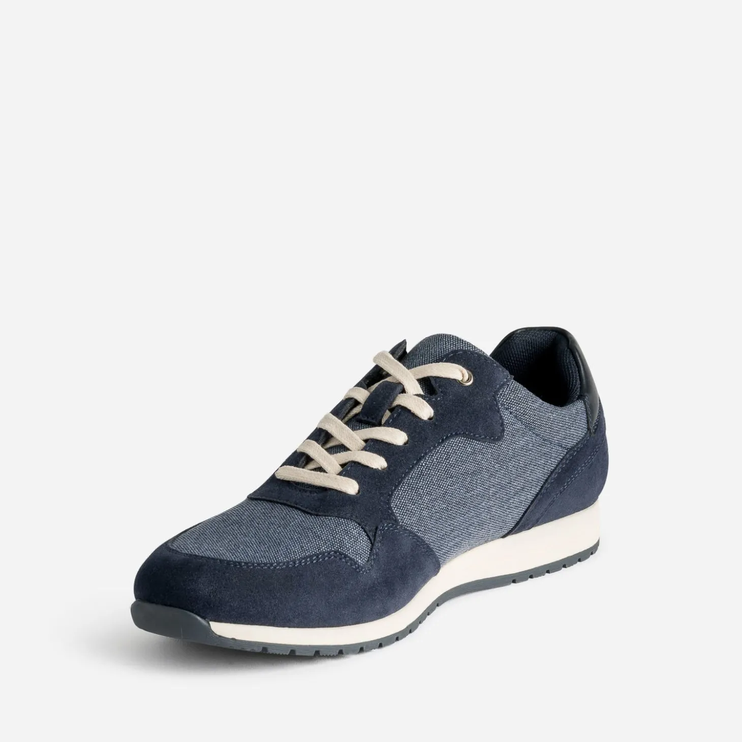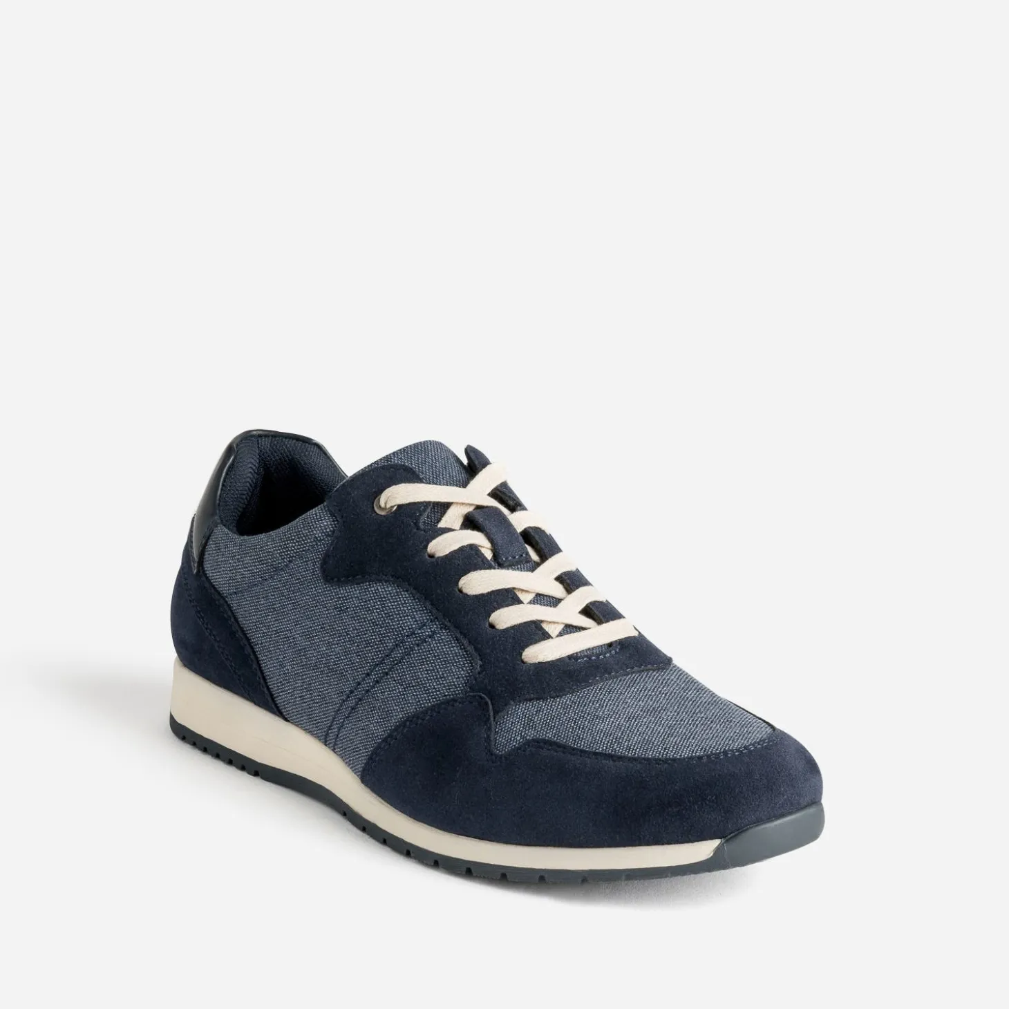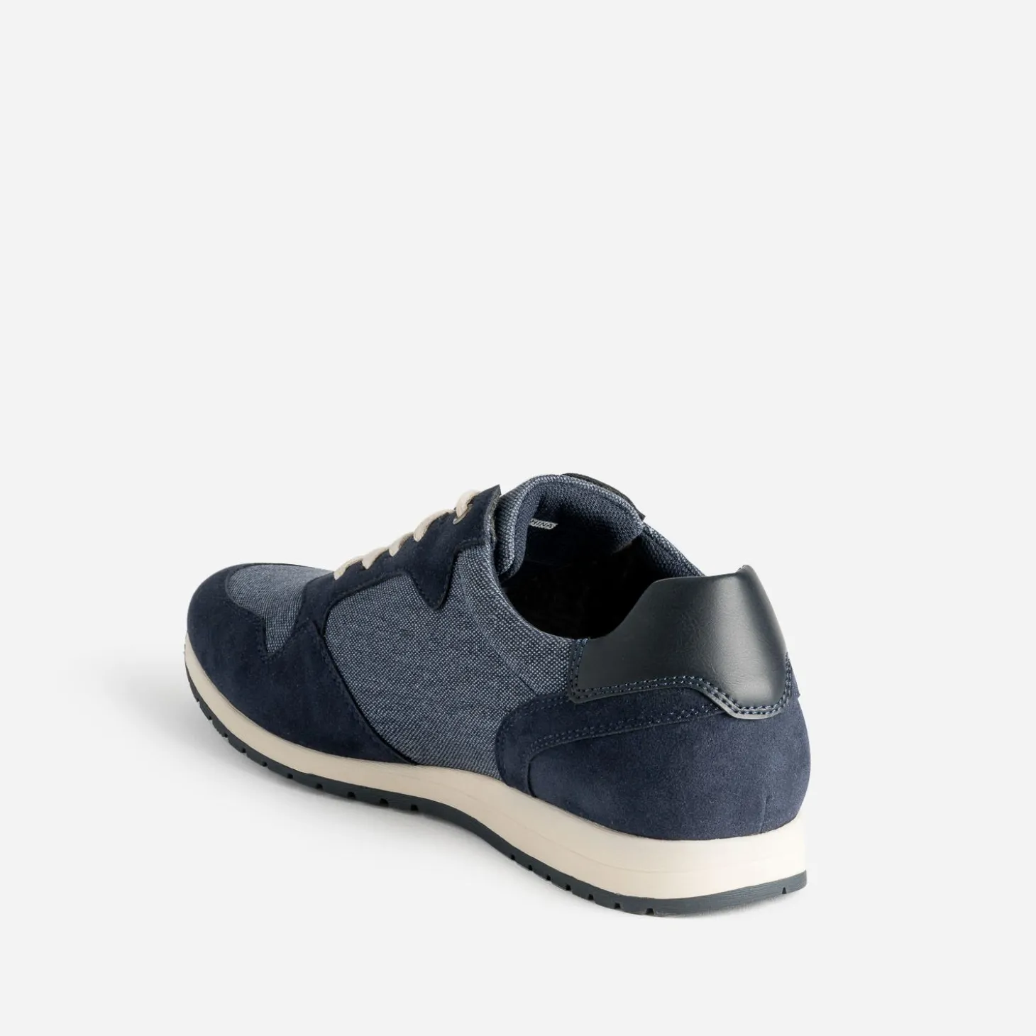 Mix matières synthétique suédée et textile chiné pour cette tennis pour homme. Bleu marine, elle présente aussi un contrefort lisse ton sur ton. Un modèle très sport, à privilégier avec une tenue décontractée, entre deux entraînements.