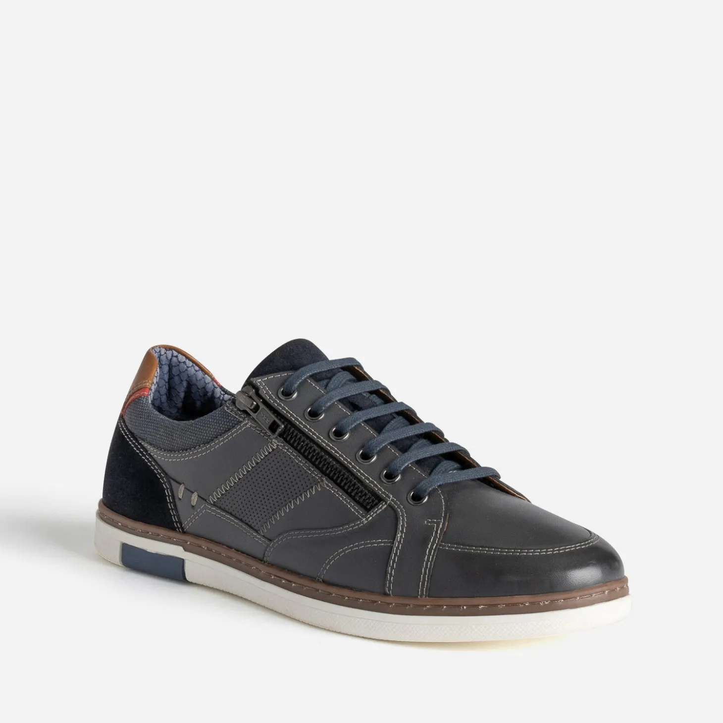 Cette tennis pour homme séduit par son cuir bleu marine, sobre, intemporel. Elle se démarque par des découpes placées avec embossage perforé sur les côtés, par des empiècements en cuir velours ton sur ton et par un contrefort cognac. La doublure est imprimée, et le double système de fermeture par lacet et zip, facilite le chaussant. Un modèle idéal avec tous vos looks du quotidien.