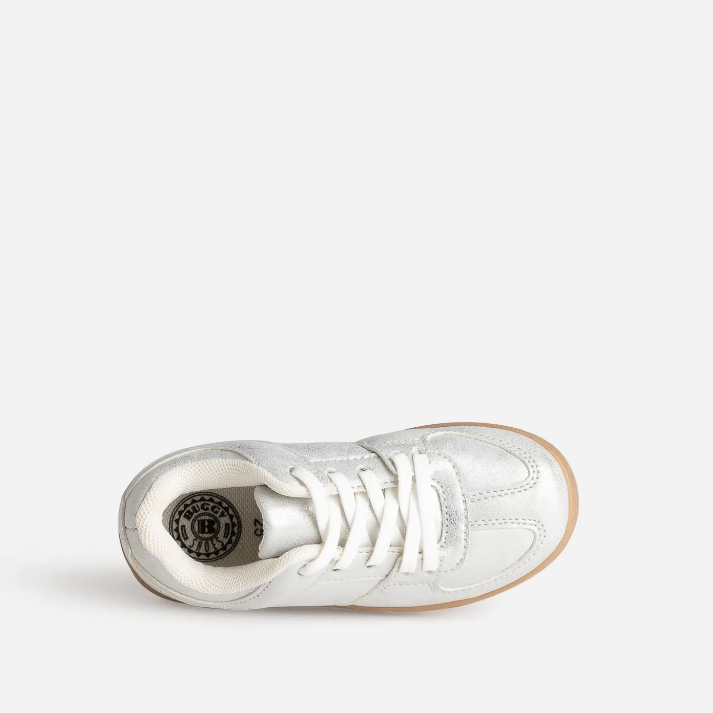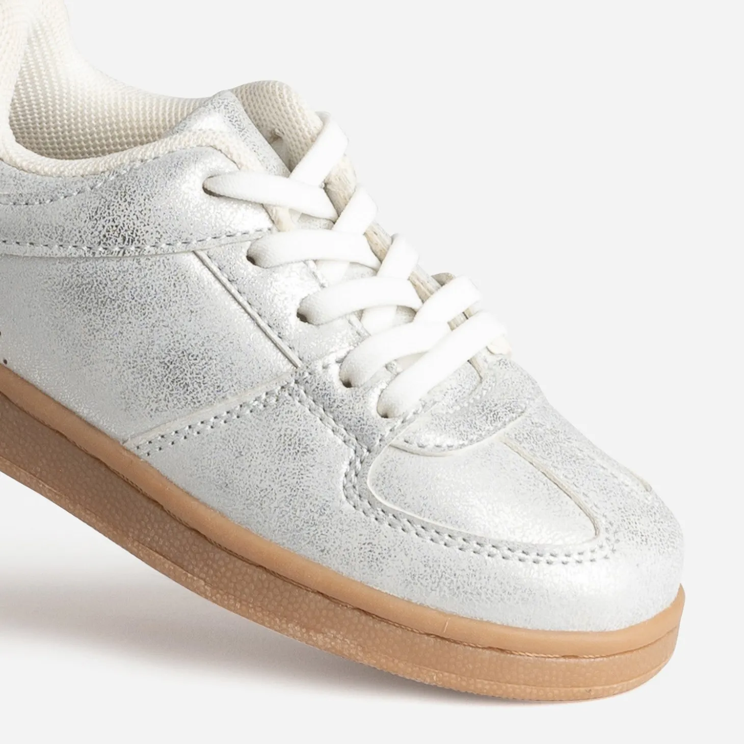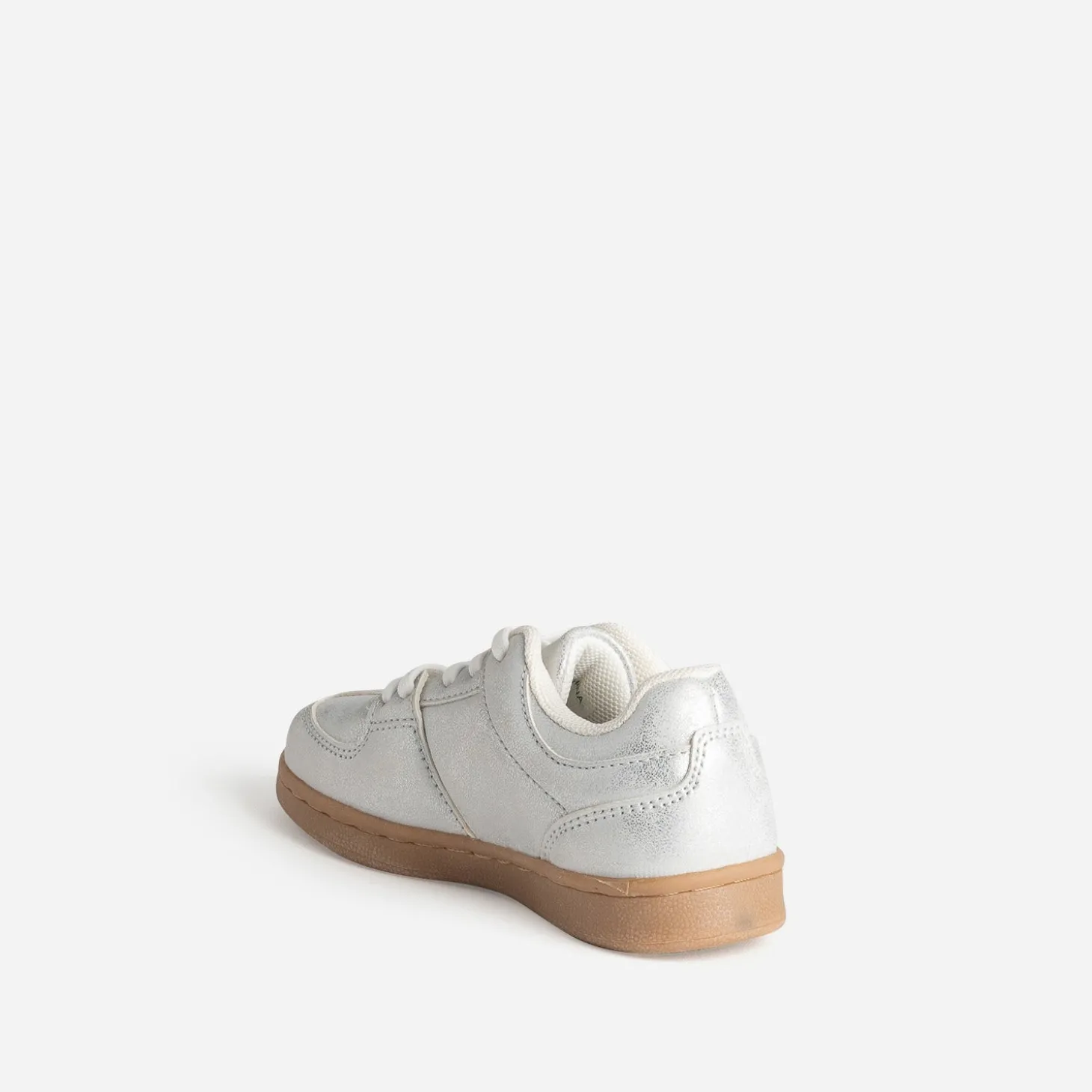 Pile dans la tendance, cette tennis n’a qu’un seul objectif : chausser les petites filles avec confort et style. En matière synthétique, elle se décline en coloris argenté, avec une finition brossée. Rythmée de découpes, elle est montée sur une semelle camel. Un modèle très actuel, qui s’accorde facilement avec des couleurs froides, comme le bleu, le vert ou le violet, et bien sur, le blanc et le gris.