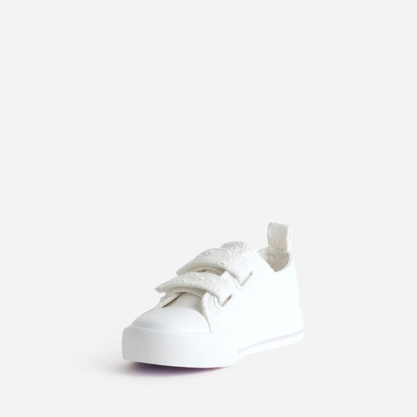 La tennis en toile est l’alliée du printemps. Blanche, elle est sublimée par une broderie anglaise ton sur ton et présente une semelle soulignée d’une ligne parme. La fermeture par double scratch accompagne les petites filles dans le développement de leur autonomie. Un modèle intemporel, à essayer avec un tee-shirt blanc et une salopette-short en jean.