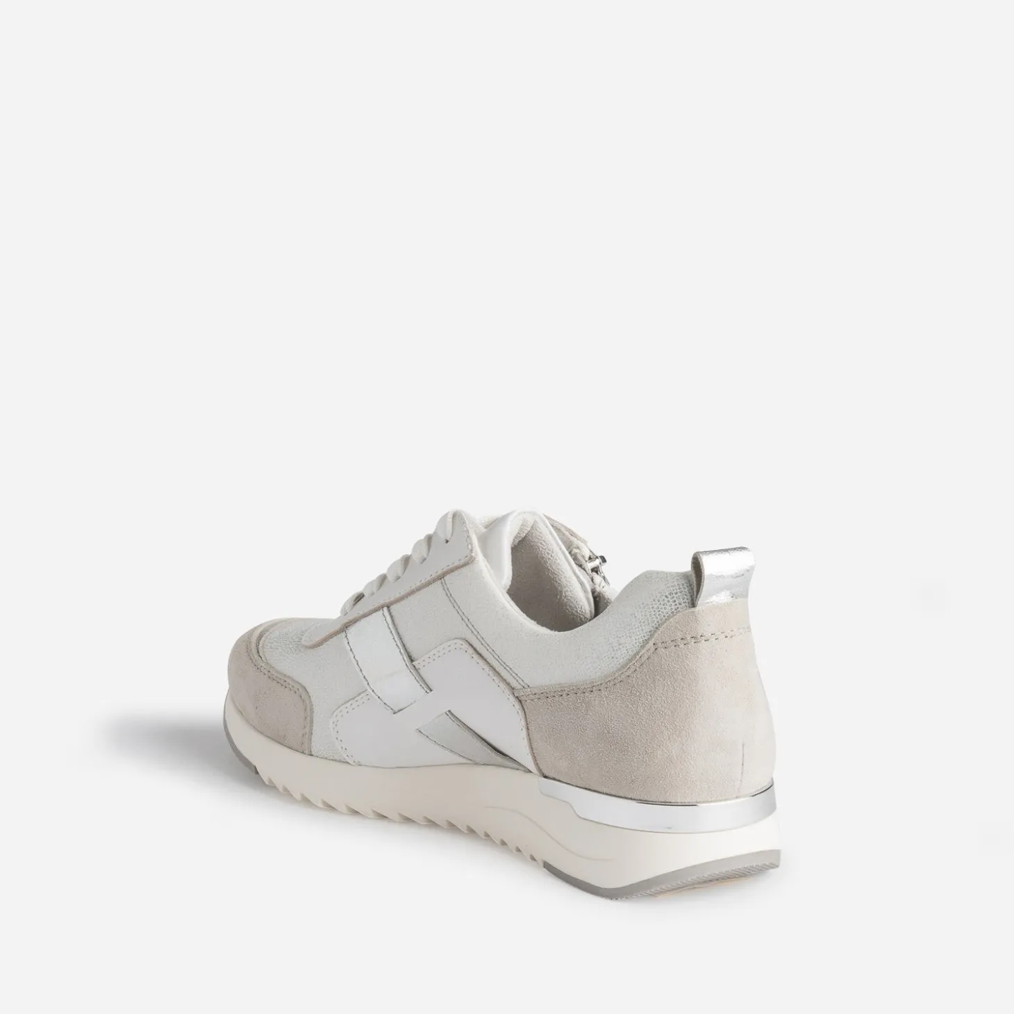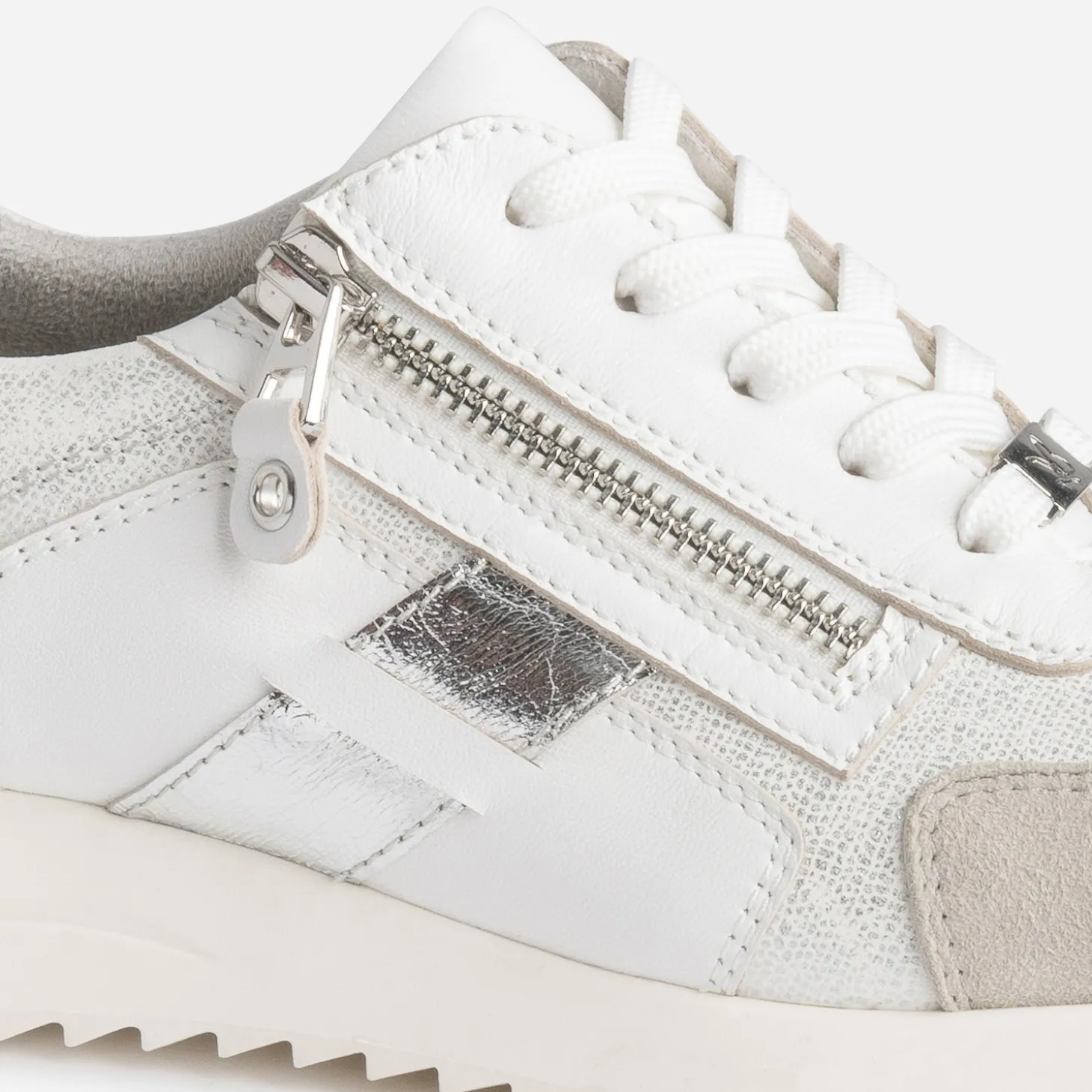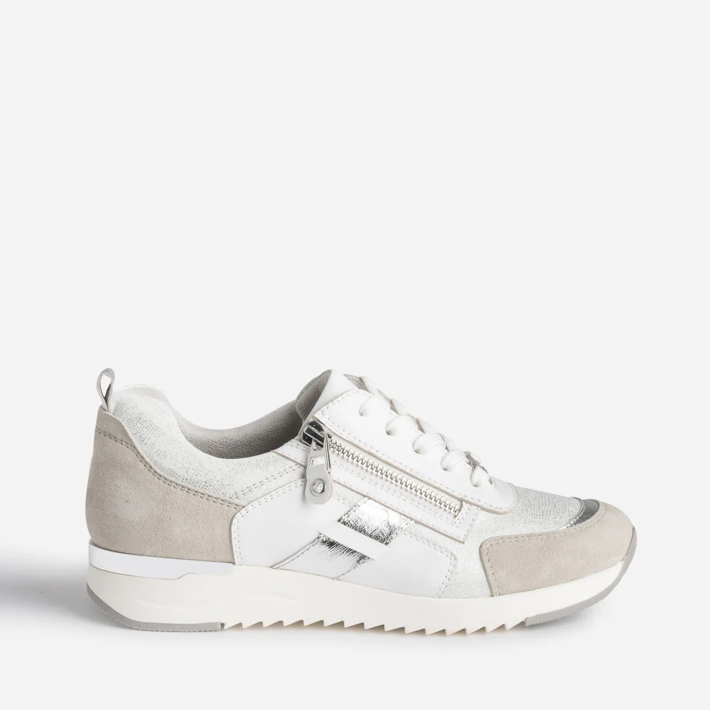 Le chausseur allemand CAPRICE réinvente le duo confort et style avec modernité. Cette tennis pour femme est un parfait exemple. En cuir et cuir velours, elle se décline en coloris blanc, rythmé de touches grises et d’un effet imprimé minimaliste argenté. Sa double fermeture, par lacet et zip côté, est un atout confort complémentaire. Un modèle à la pointe de la mode, qui va, en outre, alléger votre marche quotidienne.