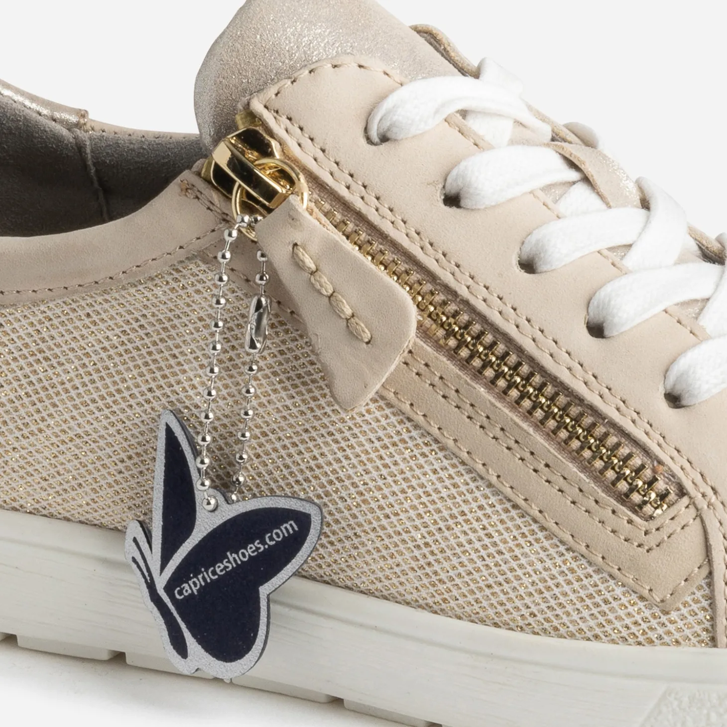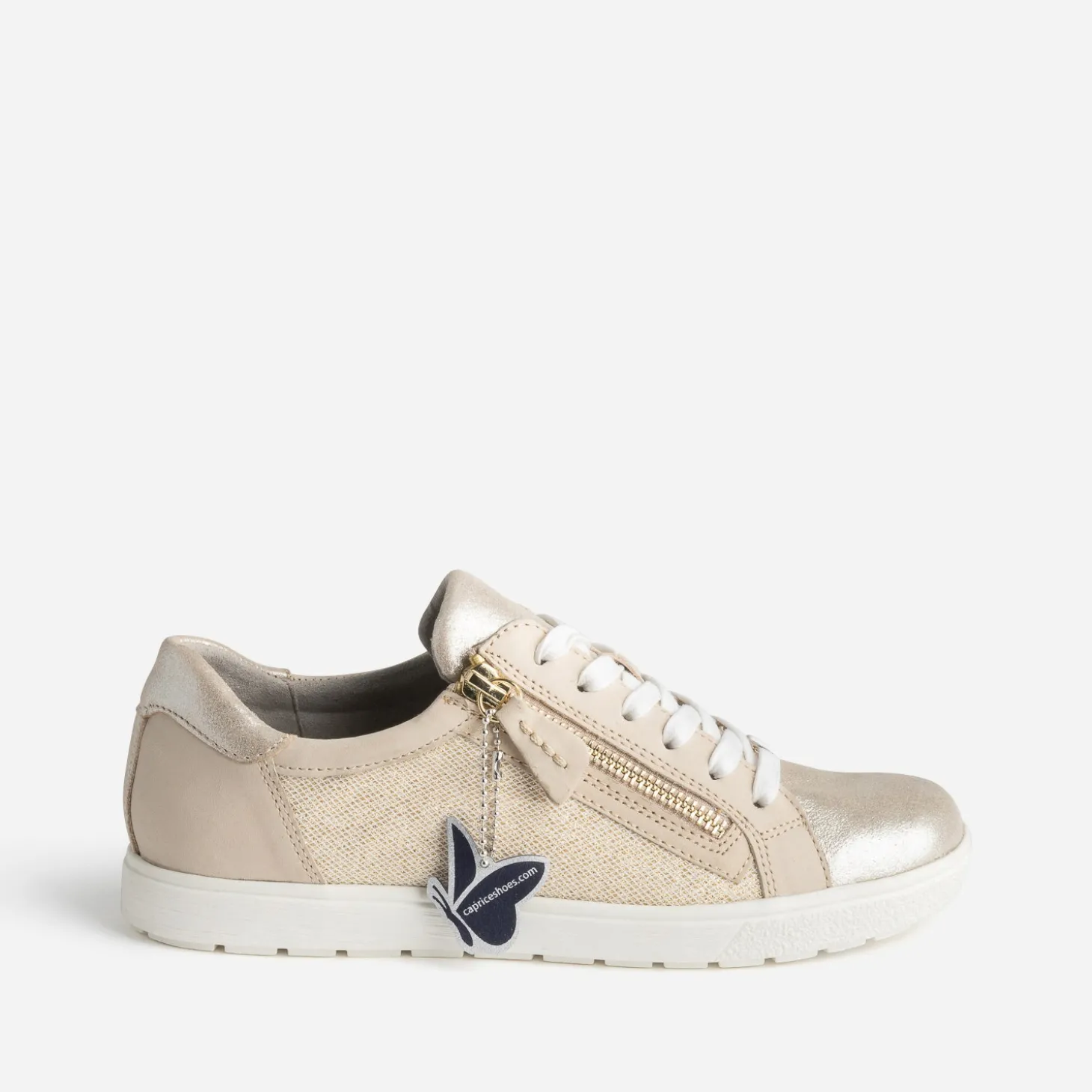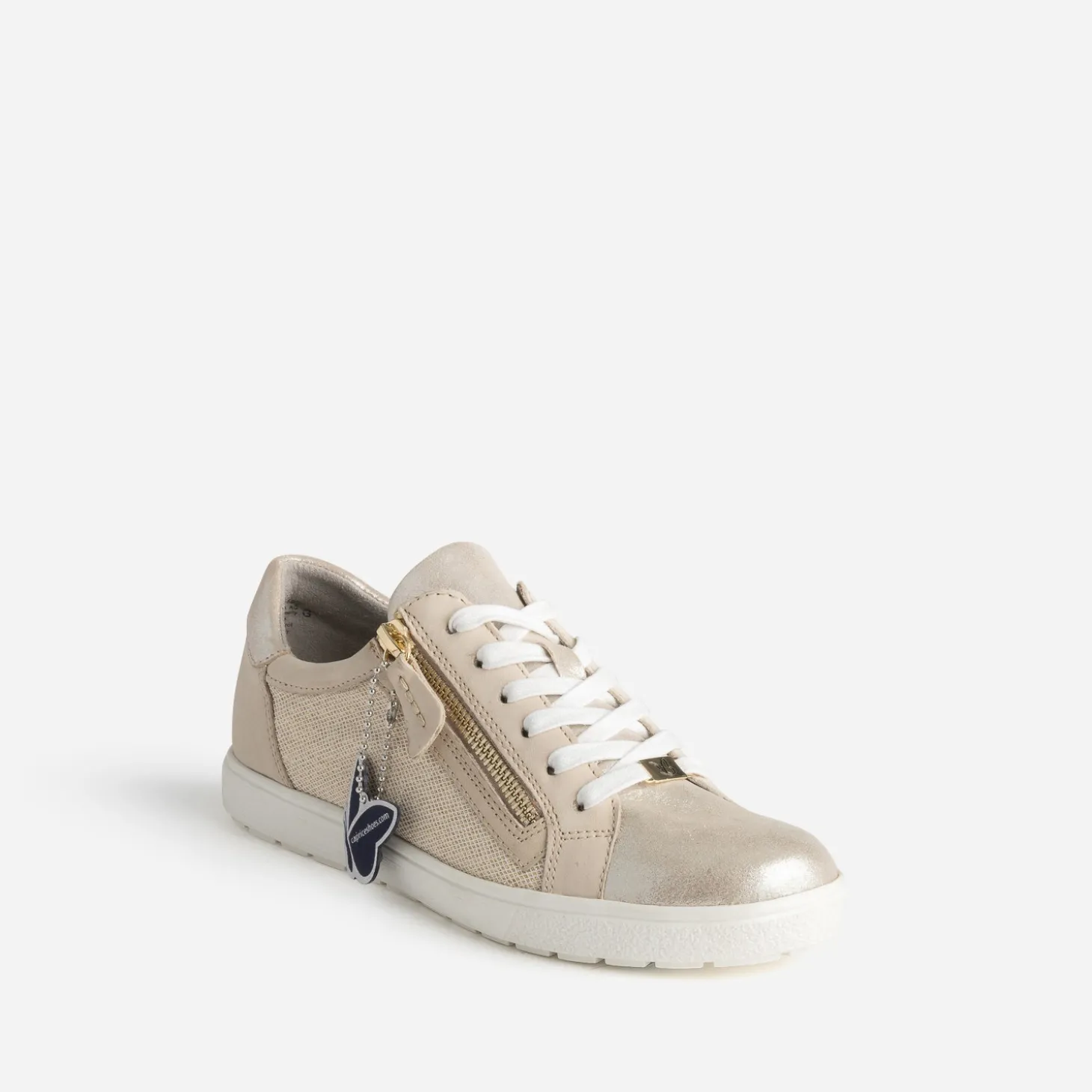 Découvrez le nouveau design de la tennis femme. Laissez-vous séduire par sa souplesse indiscutable. Mix de cuir et textile, elle est dotée de la technologie ‘onAIR’, garantissant un meilleur amorti et une aération optimale de la chaussure. Beige et dorée, elle présente une finition pailletée sur les côtés. Le laçage est renforcé par un système de fermeture complémentaire par zip extérieur. Un modèle idéal pour tous les jours, qui va vraiment soulager votre démarche.