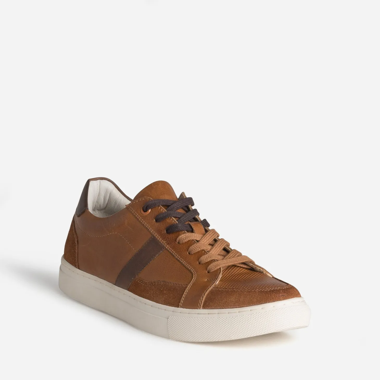 Cuir lisse, cuir velours, cuir embossé : la tennis pour homme maîtrise les découpes placées dans une harmonie étudiée. Déclinée dans un camaïeu autour du cognac, elle est livrée avec deux paires de lacets, l’un ton sur ton, l’autre marron foncé. Un modèle à privilégier avec du blanc, du bleu ou du kaki.