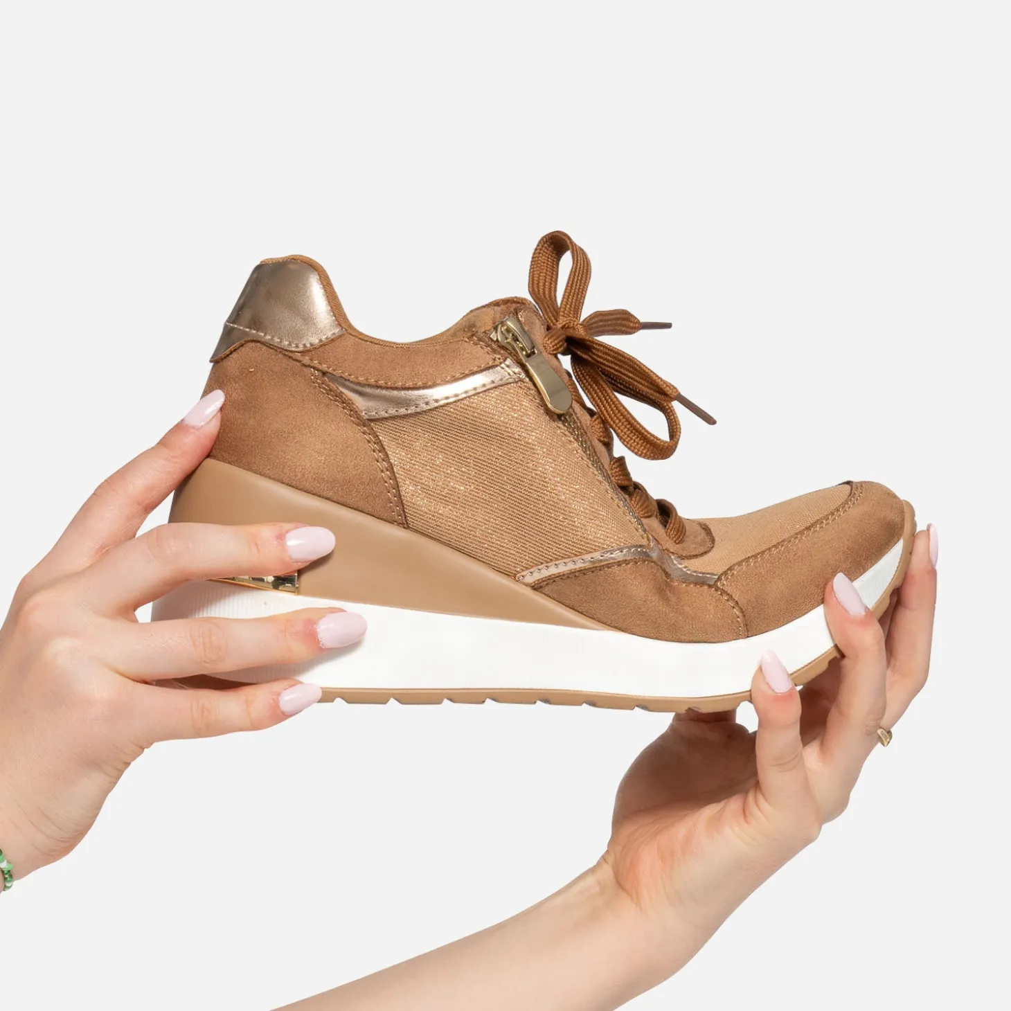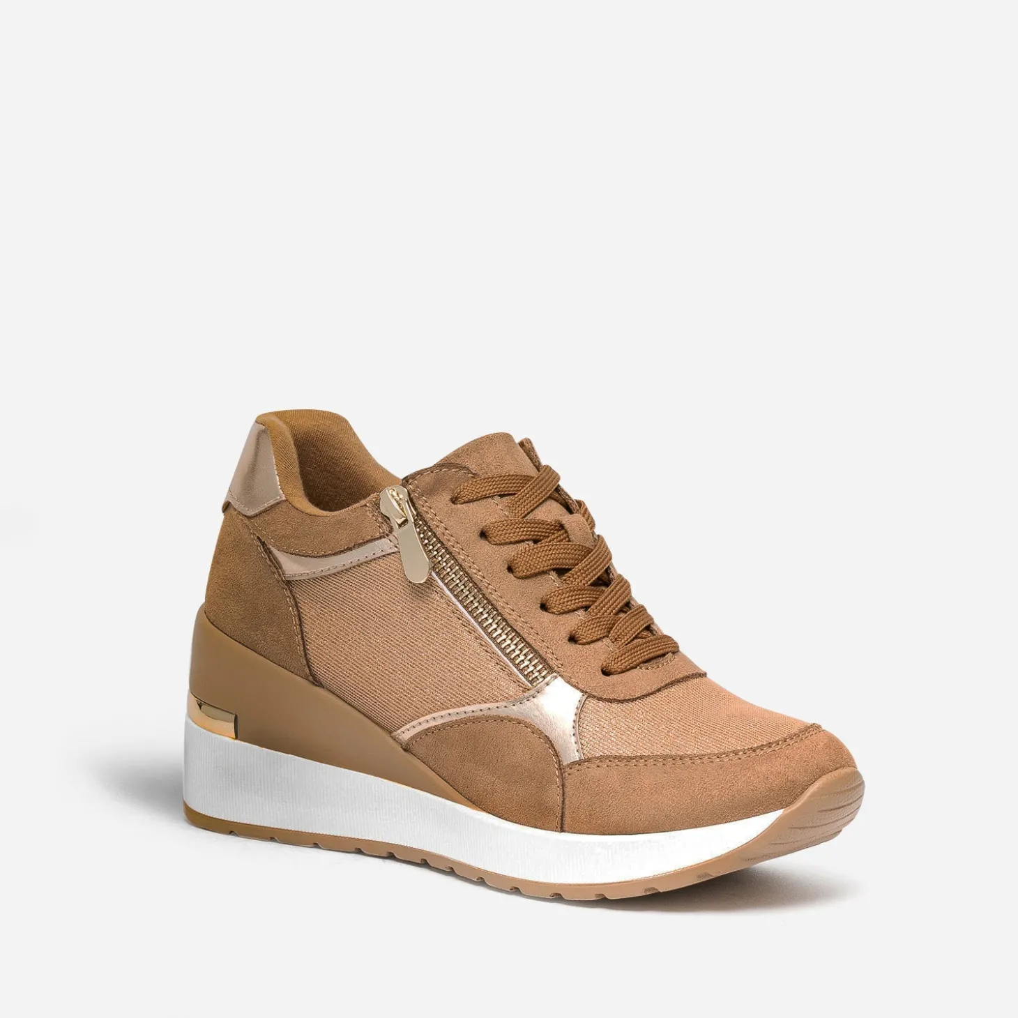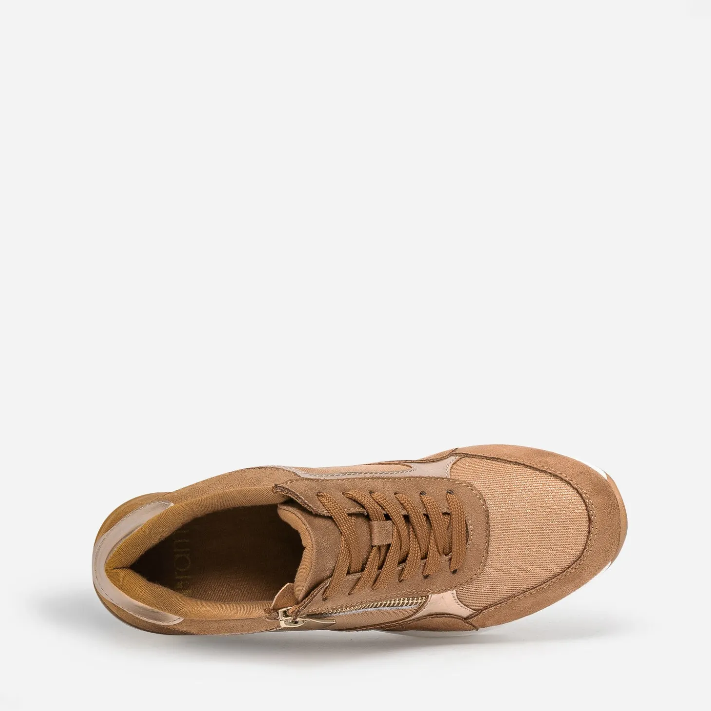 Prendre de la hauteur, même en tennis ? C’est possible avec ce modèle pour femme. Montée sur une semelle compensée de plus de 7 cm, cette basket basse bouscule les codes. Coloris camel, elle maîtrise le mélange de matières à la perfection : matières synthétiques, suédée ou vernie, et mesh pailleté. Le zip extérieur apporte du chic en s’accordant à la baguette dorée placée sur le contrefort. Essayez-la avec un tee-shirt blanc et un pantalon large de couleur foncé.