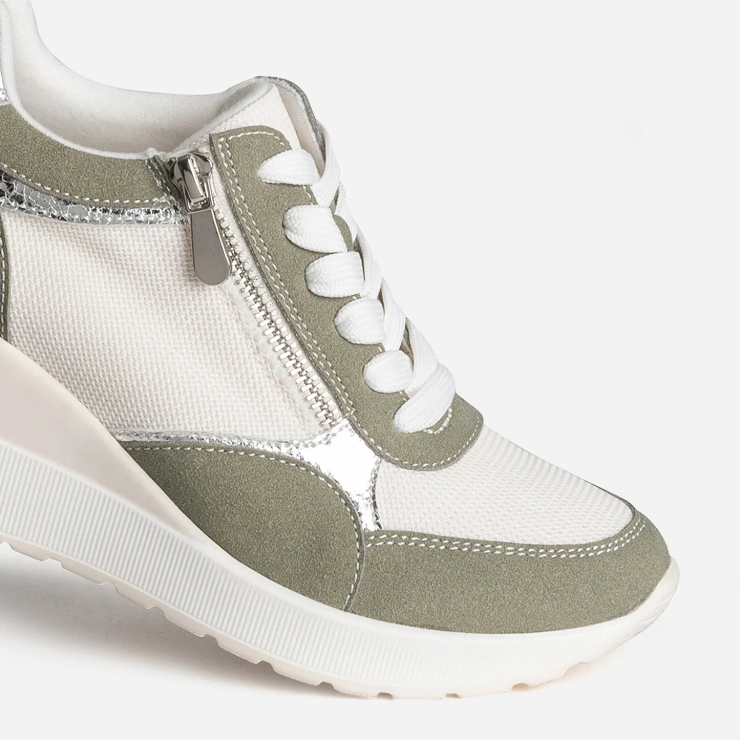 Prendre de la hauteur, même en tennis ? C’est possible avec ce modèle pour femme. Montée sur une semelle compensée de plus de 7 cm, cette basket basse bouscule les codes. Coloris kaki, blanc et argenté, elle maîtrise le mélange de matières à la perfection : matières synthétiques, suédée ou métallisée, et mesh. Le zip extérieur apporte du chic en s’accordant à la baguette argentée placée sur le contrefort. Essayez-la avec un tee-shirt blanc et un pantalon large de couleur grise.