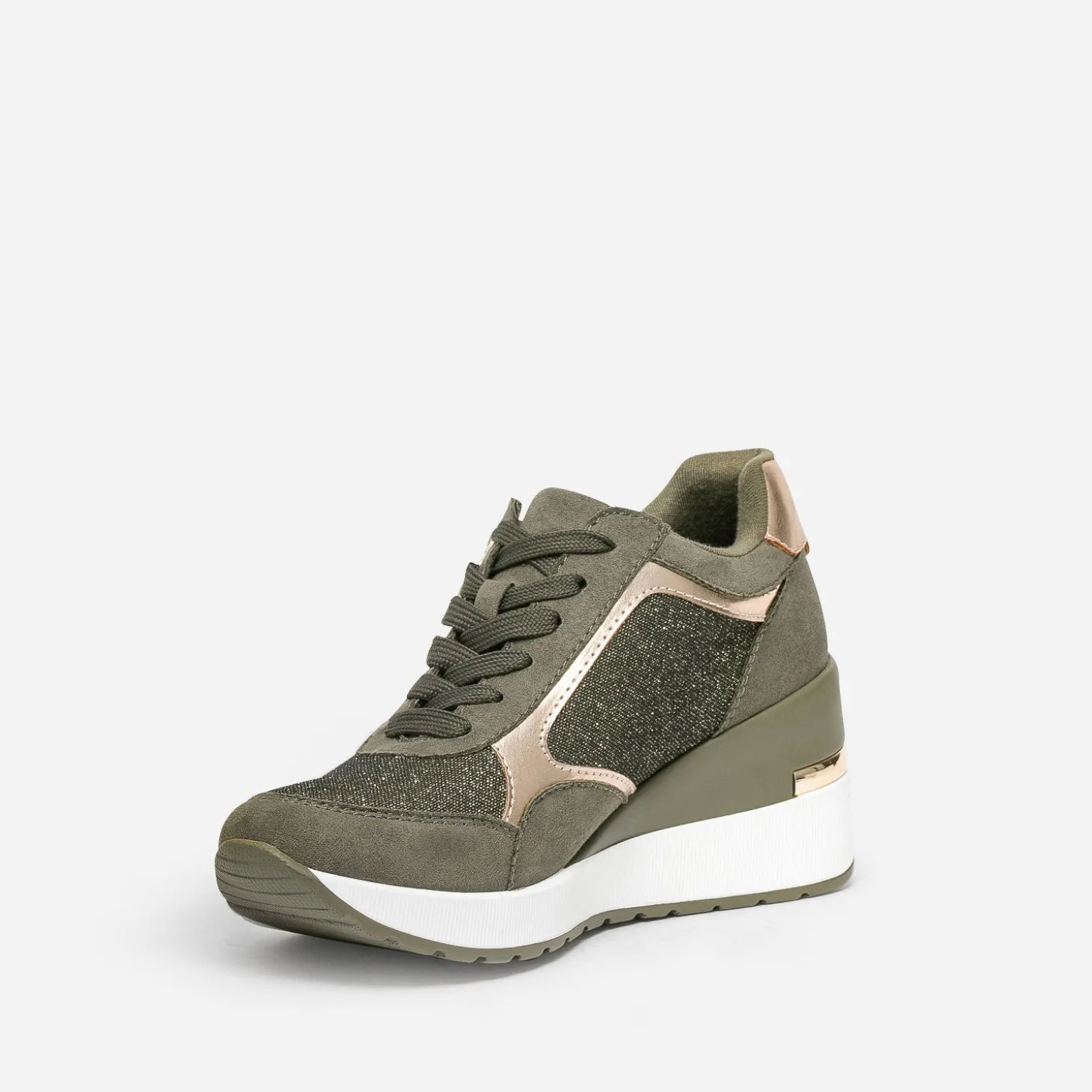 Prendre de la hauteur, même en tennis ? C’est possible avec ce modèle pour femme. Montée sur une semelle compensée de plus de 7 cm, cette basket basse bouscule les codes. Coloris kaki, elle maîtrise le mélange de matières à la perfection : matières synthétiques, suédée ou vernie, et mesh pailleté. Le zip extérieur apporte du chic en s’accordant à la baguette dorée placée sur le contrefort. Essayez-la avec un tee-shirt blanc et un pantalon large de couleur foncé.