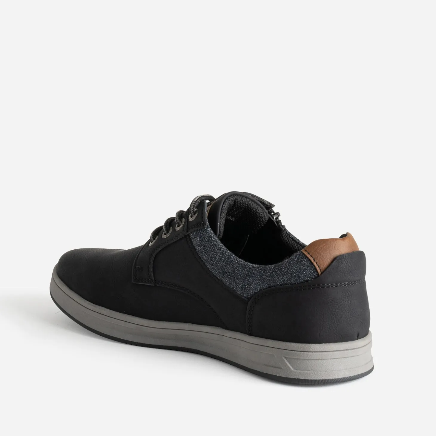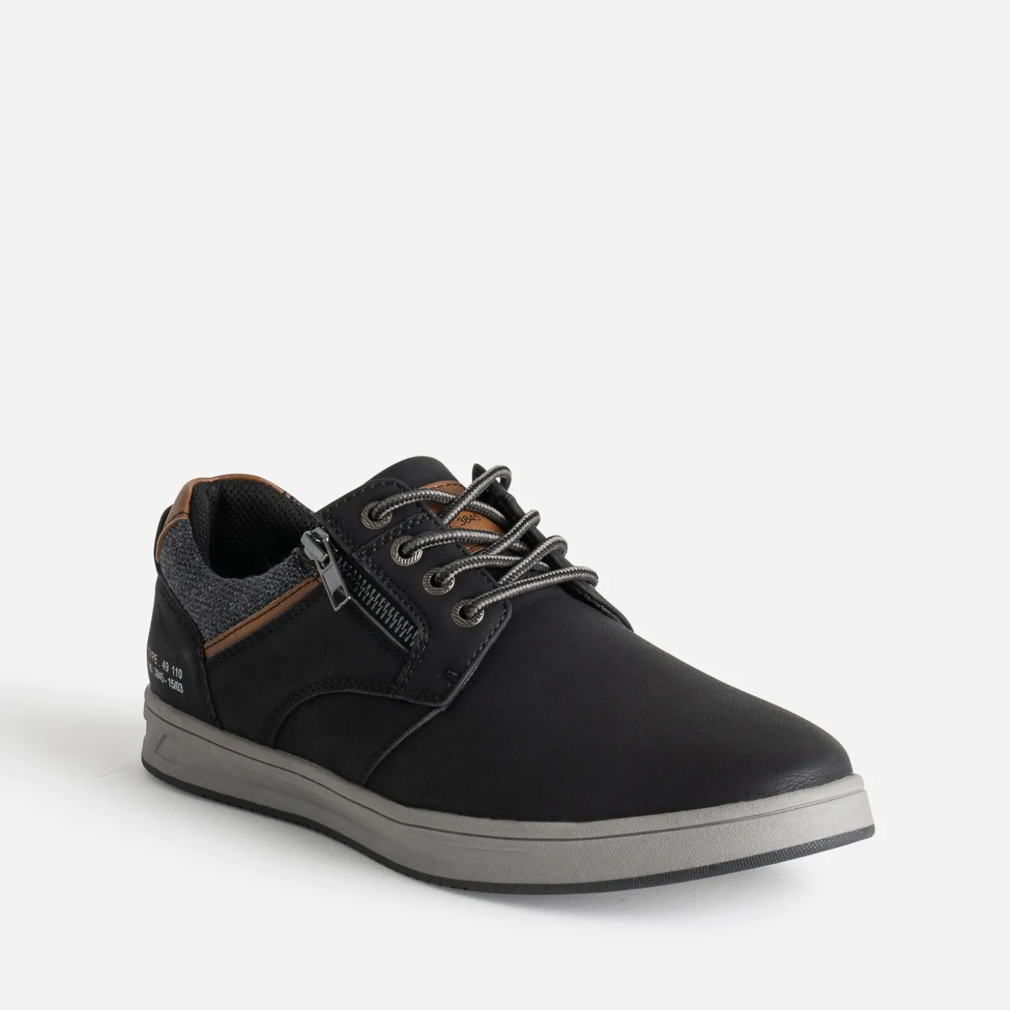 Matière synthétique souple, bordure en textile chiné, zip latéral en renfort du lacet, la tennis pour homme active son mode… confort ! Noir, gris foncé et gris clair, elle mise aussi sur les couleurs sombres pour entrer dans l’hiver. Un modèle pensé pour être porté facilement, avec tous les looks du quotidien.