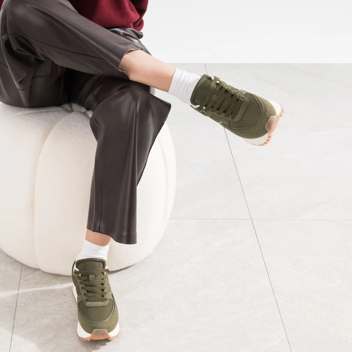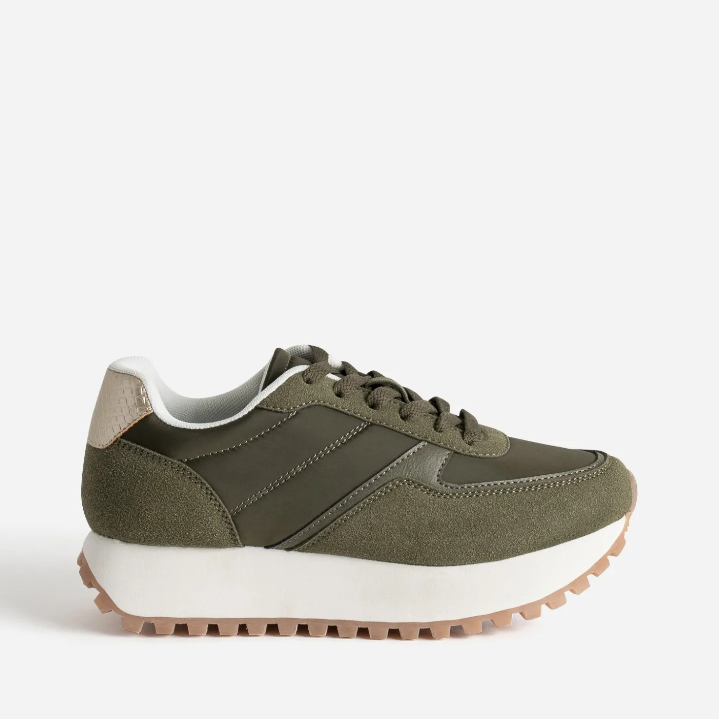 La Dad shoes, c’est, par définition, une chaussure imposante, empruntée au vestiaire homme. Revisitée par des jeux de matières synthétiques lisses ou suédées, elle est reconnaissable à sa semelle épaisse façon plateforme et crantée. Coloris kaki, elle se démarque par un contrefort doré à embossage effet python. Un modèle audacieux, à associer avec du beige, du camel, dans un style casual.