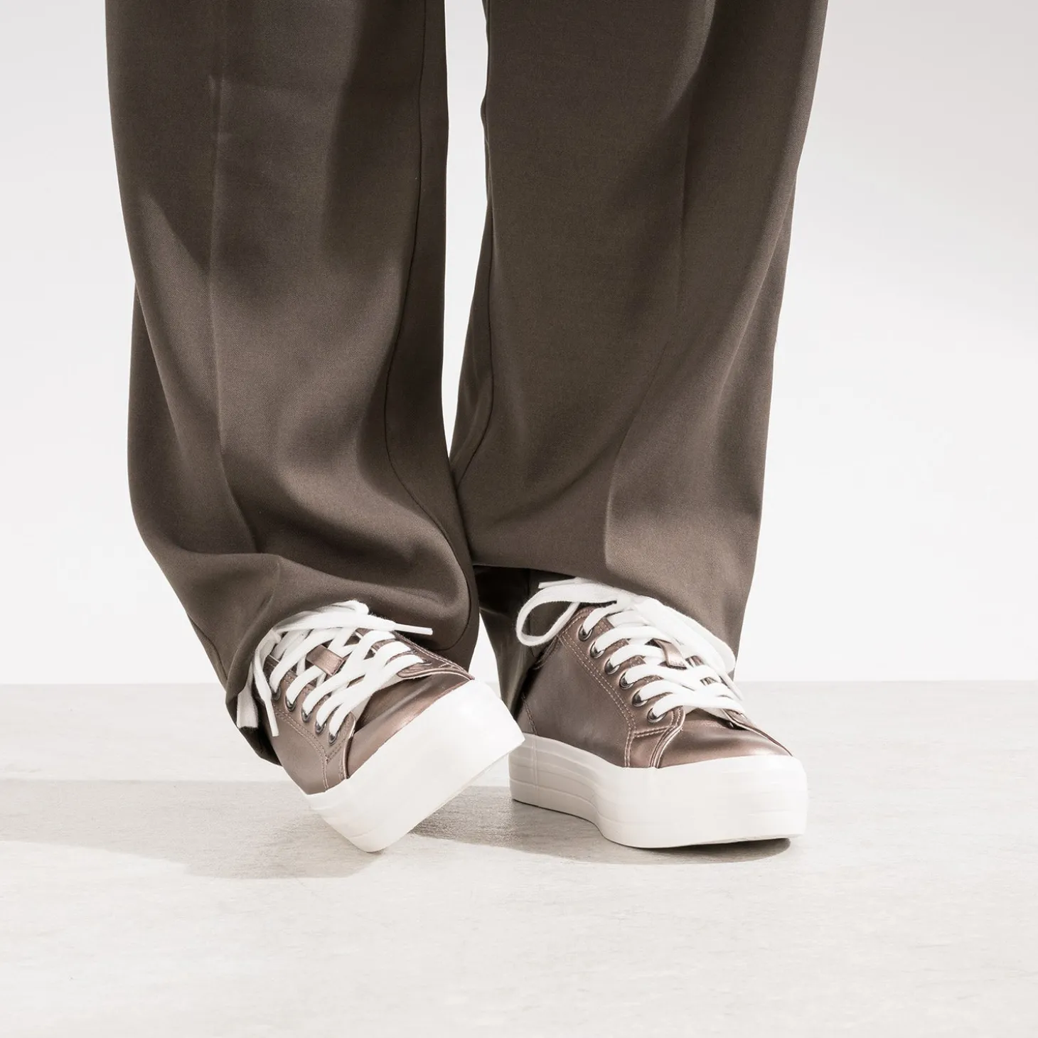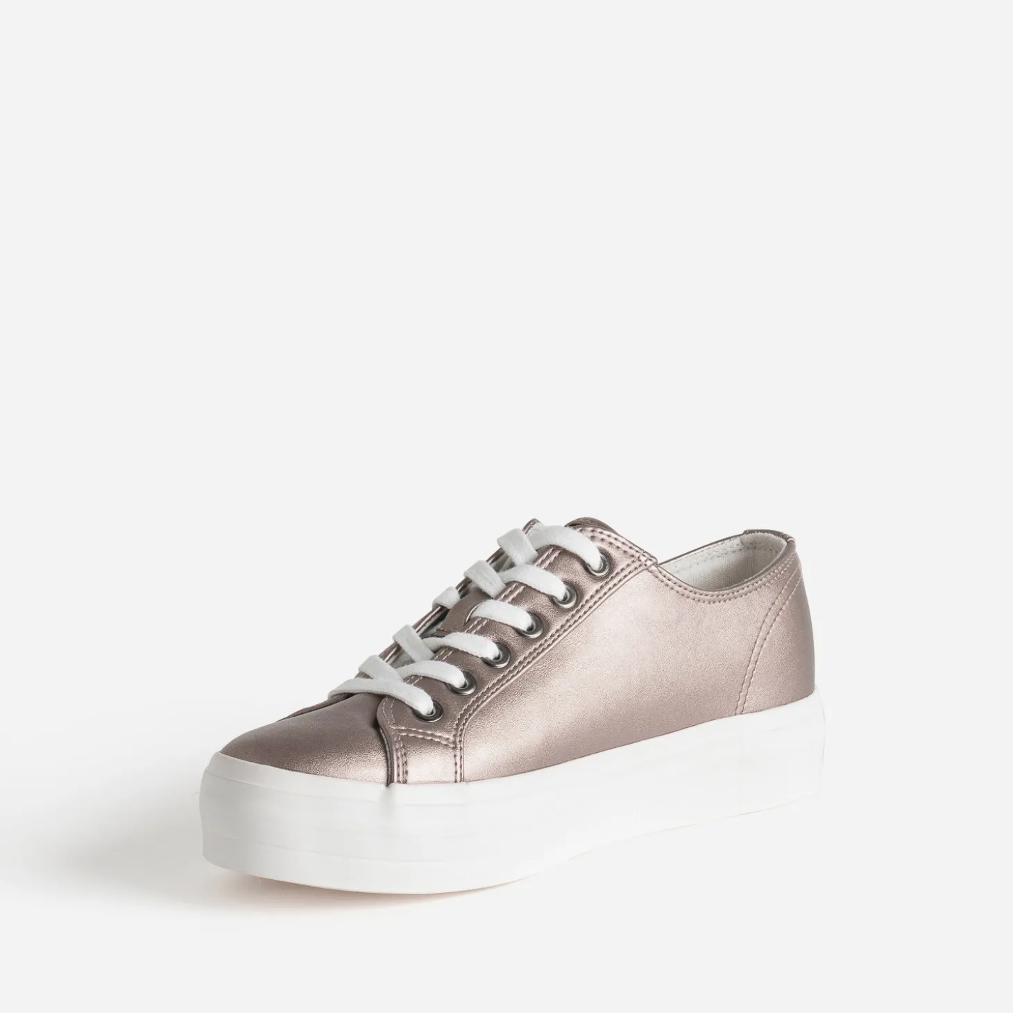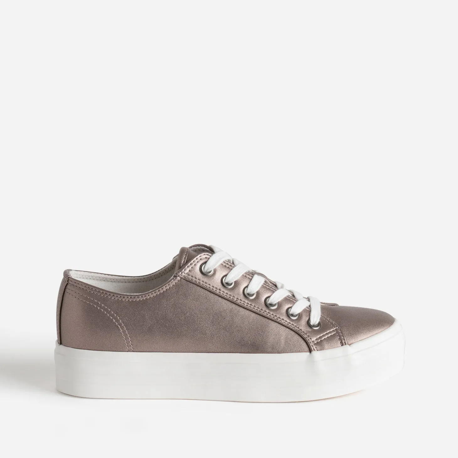 3,5 cm. C’est le nombre de centimètres gagnés en chaussant cette tennis pour femme. En matière synthétique lisse, elle se décline en coloris gris foncé, avec finition métallisée, sur une semelle blanche à plateforme, assortie au lacet. Un modèle idéal pour la mi-saison, à jouer avec des nuances de gris et un look décontracté.