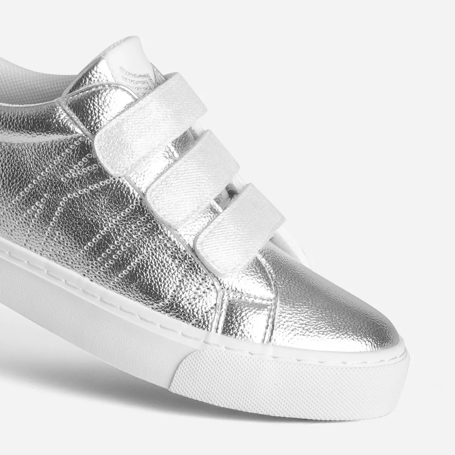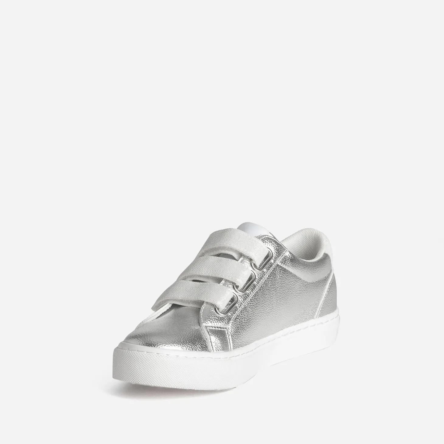 Envie d’une touche de brillance au quotidien ? Craquez pour la tennis. En matière synthétique lisse argentée, elle démarque par un maxi logo KJ, joué par perforations, sur le côté, et un contrefort blanc embossé effet python. Elle se ferme par trois scratchs en textile irisé, en écho au logo sur l’étiquette tissée, posée sur la languette. Un modèle très fashion, aussi à l’aise avec un tee-shirt et un jean, qu’avec une jupe longue plissée ou un costume dans des tons froids (bleu, vert, gris, violet).