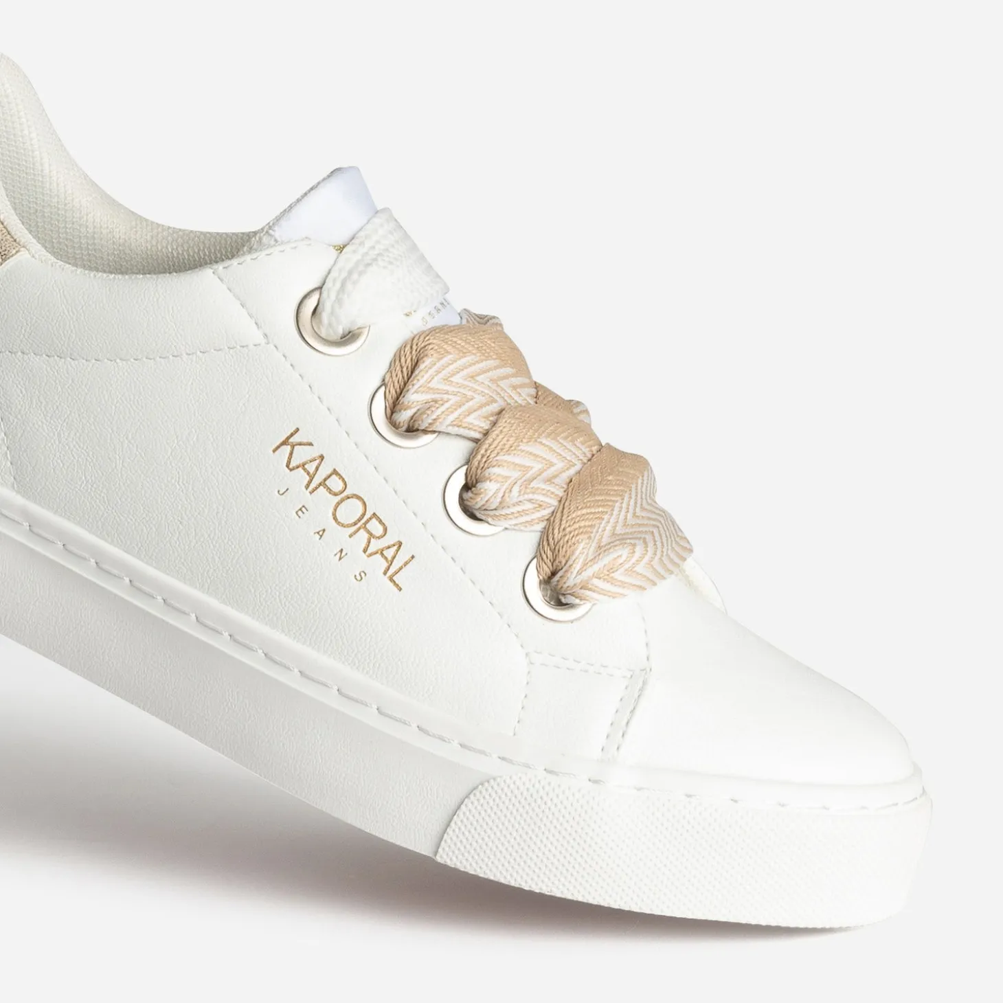 Dessus et languette lisses, contrefort métallisé doré, le tout en matière synthétique, doublure et première 100% textile, cette tennis pour femme est un parfait équilibre entre mode et confort. Déclinée en coloris blanc, elle est livrée avec deux paires de lacets, un à motif chevrons beige et blanc et un ton sur ton. Un modèle facile à adapter à votre look ou votre humeur du moment.