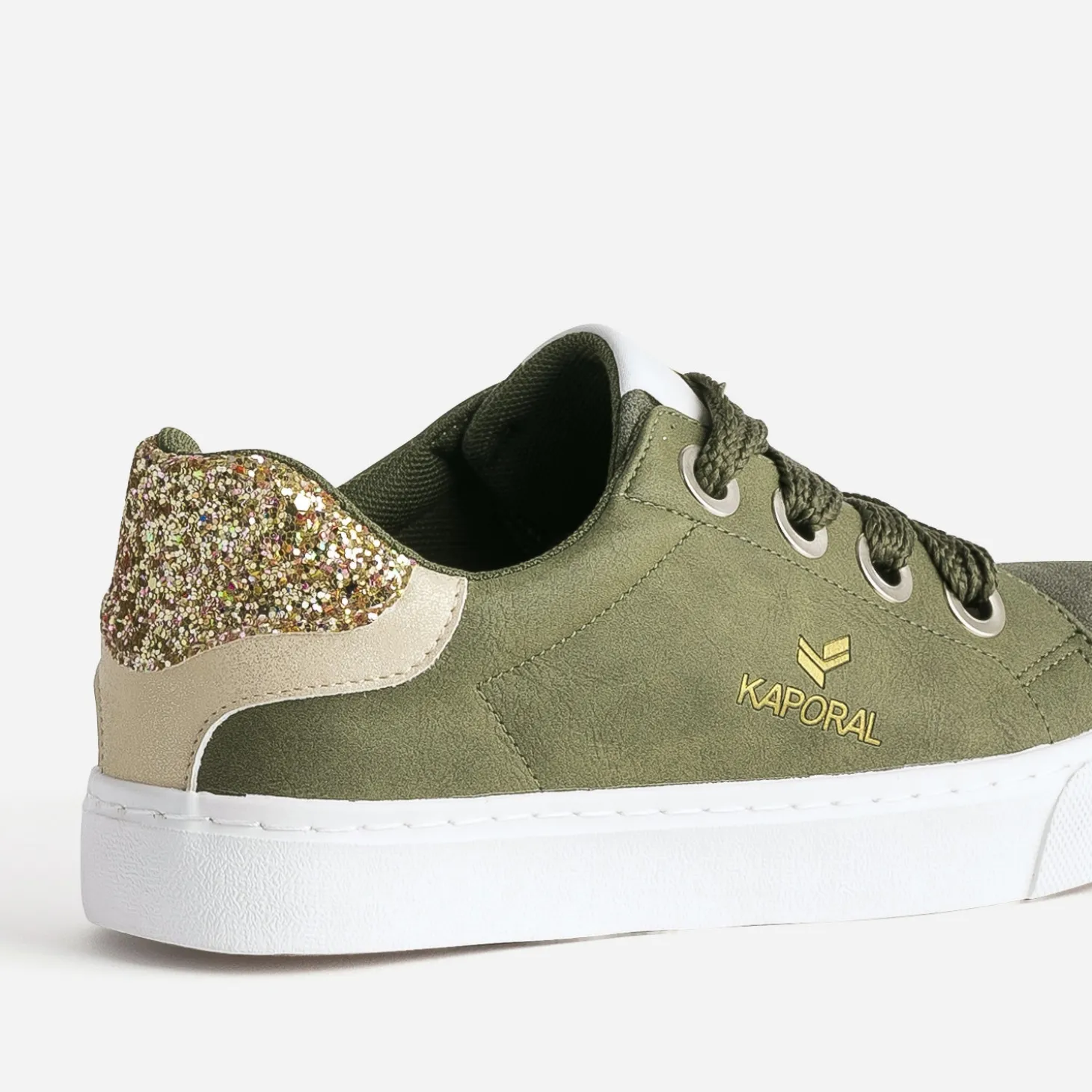 Côtés lisses, dessus et languette légèrement texturés, contrefort pailleté, le tout en matière synthétique, doublure et première 100% textile, cette tennis pour femme est un parfait équilibre entre mode et confort. Déclinée en coloris kaki, elle se démarque par ses 2 paires de lacets, 1 version ruban satiné imprimé et 1 large ton sur ton. Un modèle facile à adapter à votre look ou votre humeur du moment.