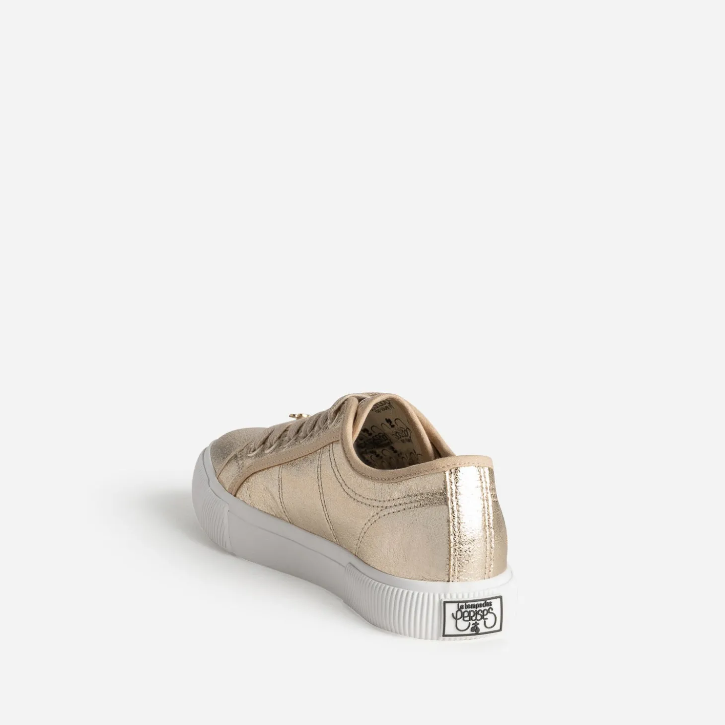 Cette tennis est un classique de la marque. En toile dorée unie, elle est rythmée de découpes et décorée d’un charm’ cerises en métal jaune glissé sur le lacet. La doublure intérieure accueille un marquage logos noirs, la languette, une étiquette tissée, et le talon, une broderie cerises. Une basket basse pour femme, qui affirme sa différence.