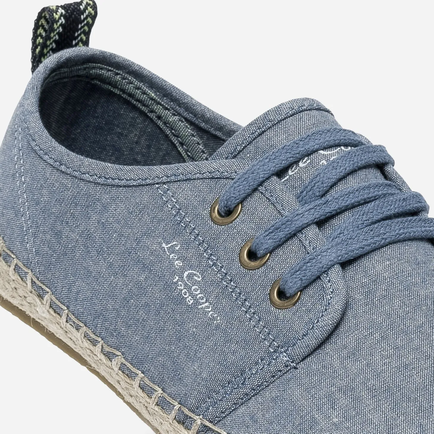 Appréhendez l’été sans compromettre votre style, avec cette chaussure hybride, mix parfait entre la tennis et l’espadrille. Confectionnée en toile bleu esprit chambray, avec doublure et première en textile assorti, elle est montée sur une semelle imitation crêpe, soulignée de corde naturelle. Un galon fantaisie placé sur le contrefort facilite l’entrée du pied. Un modèle à privilégier avec un tee-shirt ou une chemise légère et un bermuda beige ou kaki, en mode vacances.