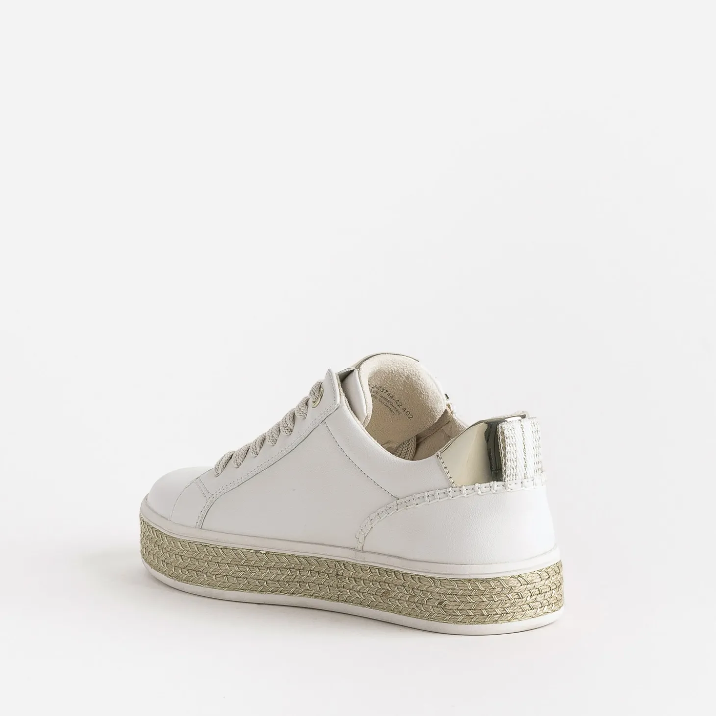 Nouveau design pour la tennis femme. Confectionnée en matière synthétique, elle se décline en coloris beige mat, idéal pour une transition de saison en douceur. Sa singularité, c’est sa semelle, bordée de cordes avec fils dorés, en écho aux métalleries et au contrefort. A l’intérieur, la semelle première amovible permet d’accueillir votre semelle orthopédique pour toujours plus de confort. Le lacet pailleté est doublé par un zip sur le côté, pour faciliter l’entrée et la sortie du pied. Associez-la avec des tons blancs ou kaki.